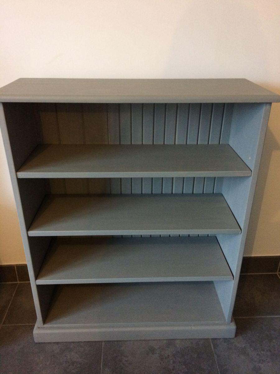 Bibliothèque en épicéa repeinte avec un badigeon gris perle , 3 tablettes amovibles.