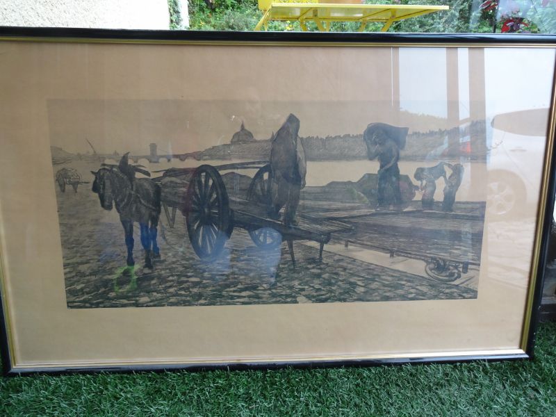 eau forte de Adrien GODIEN représentant le transfert de matériaux de construction d’une péniche sur le Rhône a une charrette tirée par des chevaux avec pour fond l’Hôtel Dieu