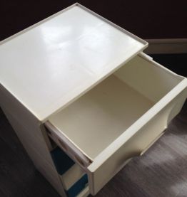 Petit meuble de rangement à 4 tiroirs en plastique moulé bicolore créme / bleu designer Marc Held pour prisunic dans les années 70 .Bon état général , quelques traces d'usure , une marque sur le dessus.Nettoyé et entretenu .