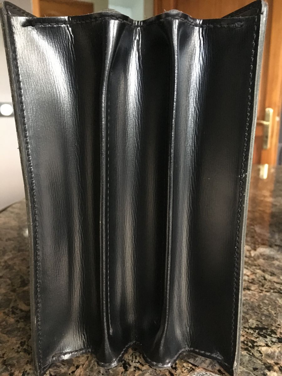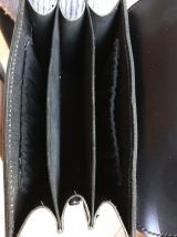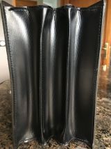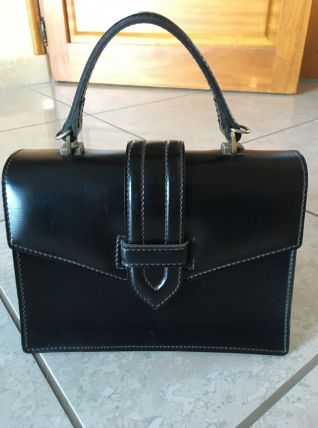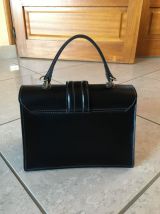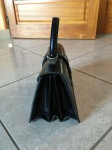 Sac à main vintage des années 70 façon petit cartable en simili cuir noir, intérieur tissu noir, 3 compartiments