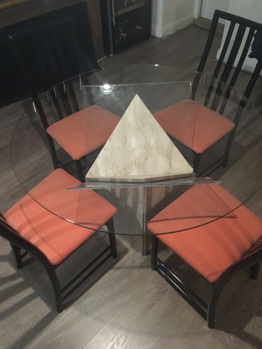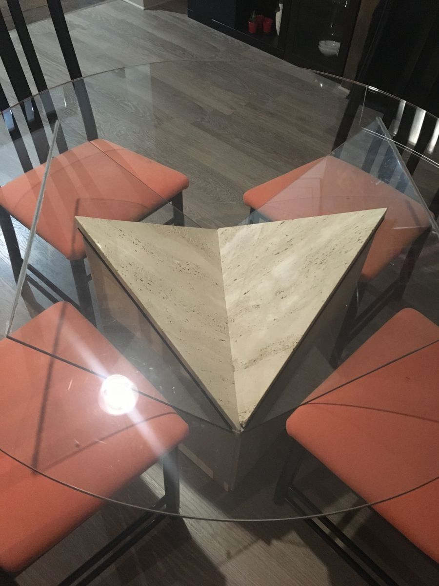 Table ronde avec pied en marbre massif. Plateau rond en verre