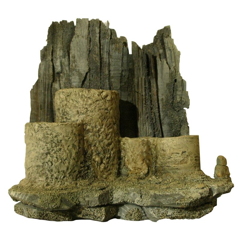 Diorama artisanal des années 90, représentant 4 tours de château devant une falaise en pierre. Avec une attache arrière pour présentation murale.