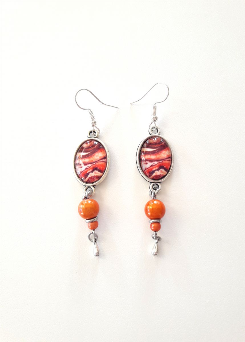 Jolies boucles d'oreilles cabochons ethniques fait main. Tons orange.