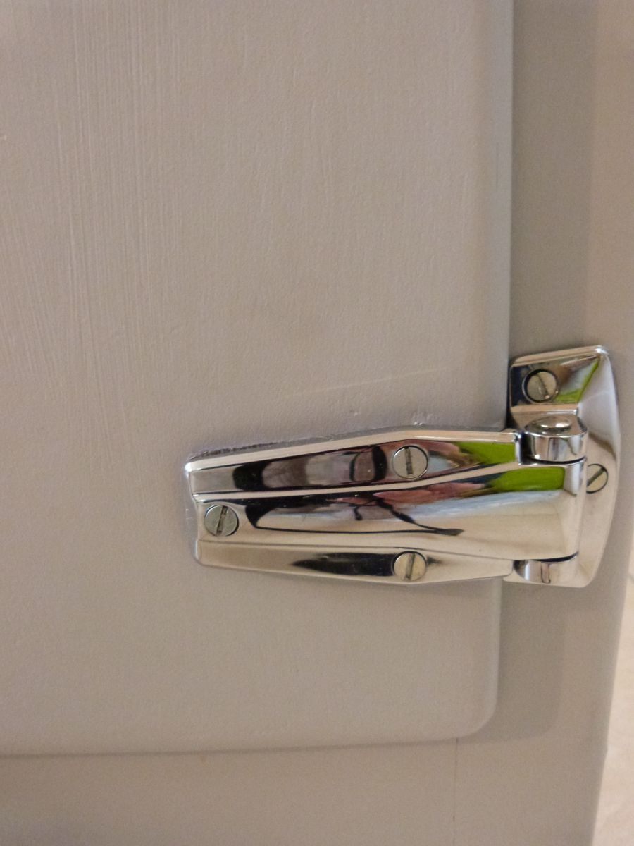 Armoire avec belles charnières Fermob en chrome, poignées art déco d'origine qui fonctionnent encore bien (pression en haut et en bas en même temps).