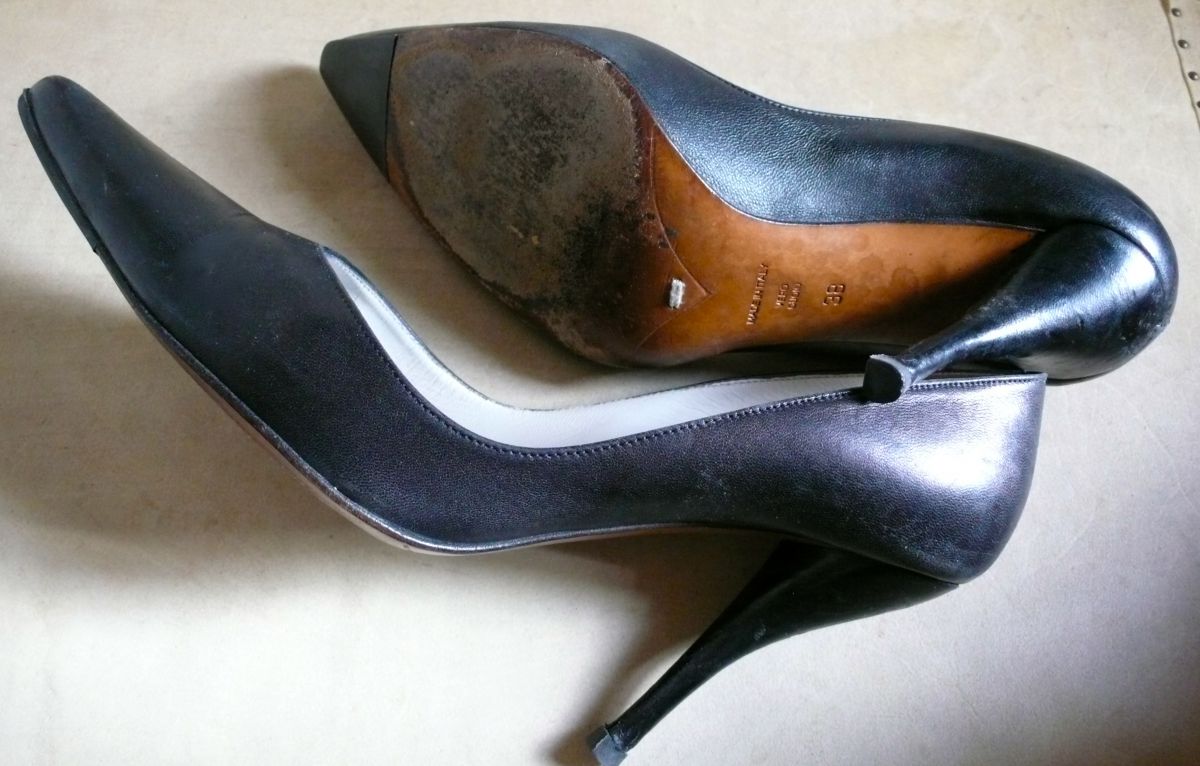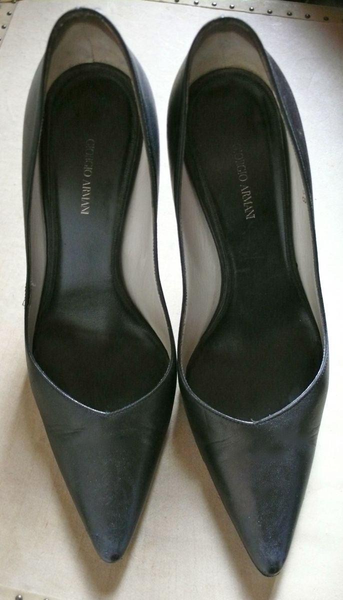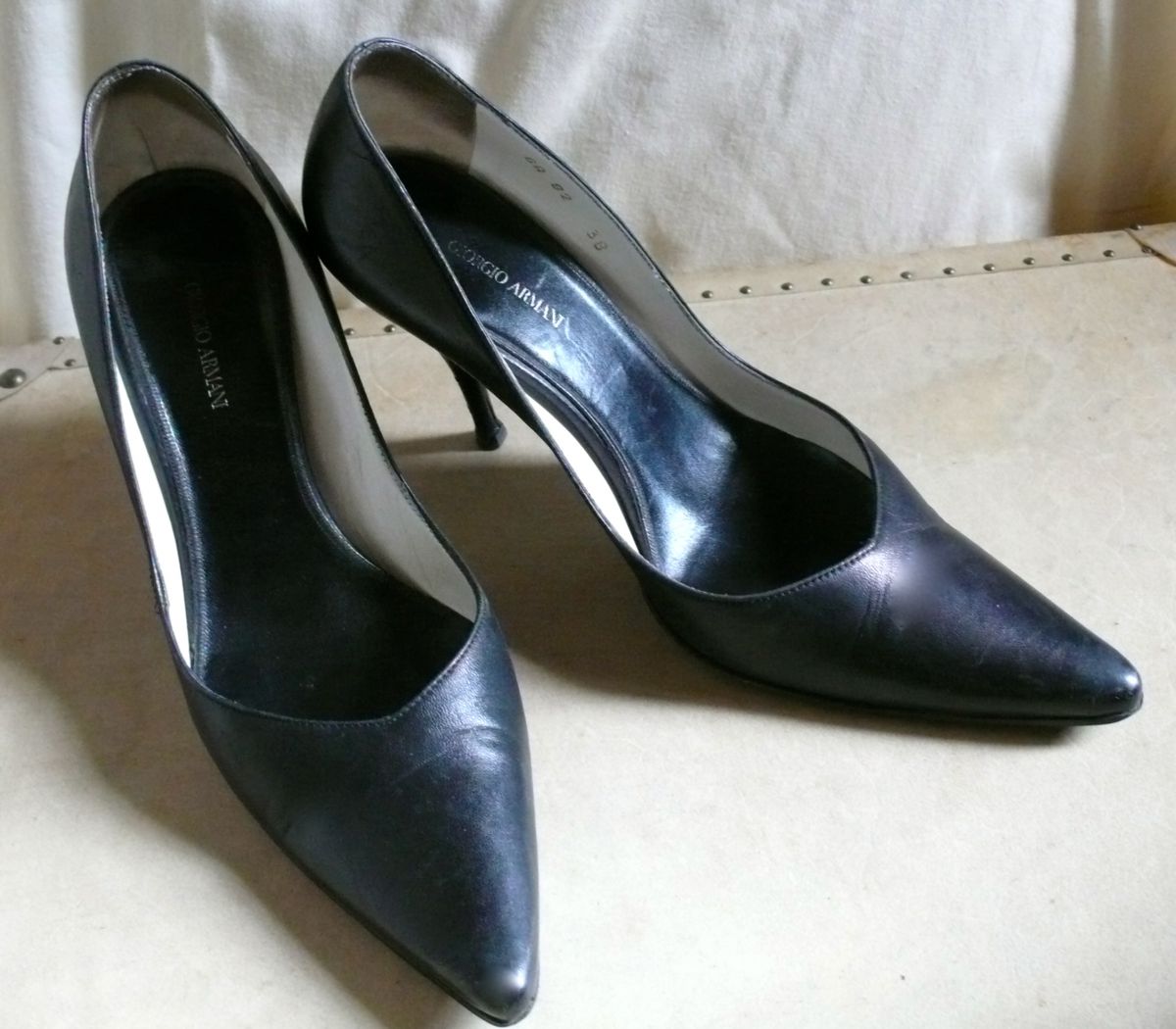 Escarpins noirs tout en cuir souple de Giorgio Armani. Un design sobre, élégant et indémodable. Doublés blanc/grisé. Talons aiguilles de 10 cm. Pointure 38 italien qui correspond à un 39. Longueur du pied 27,5 cm.