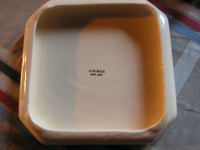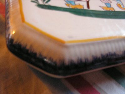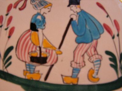 Ancien dessous de plat peint à la main au couleur de Lisieux, représentant un couple normand en sabot et en costume traditionnel.