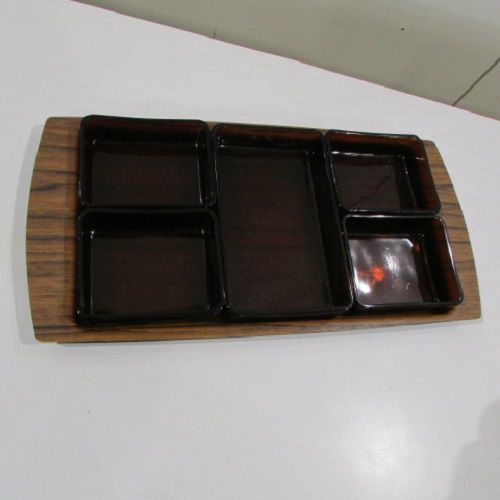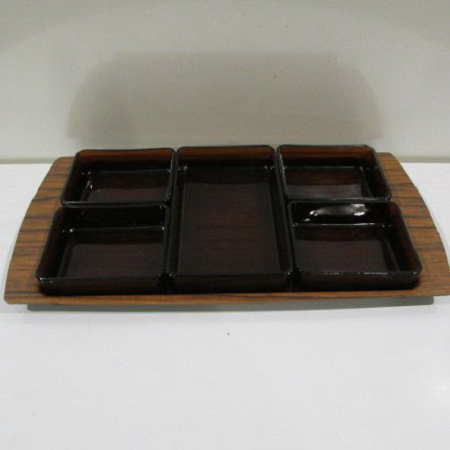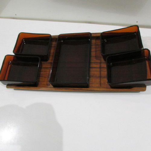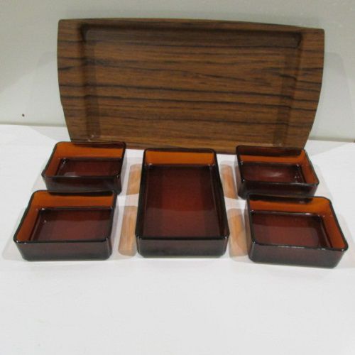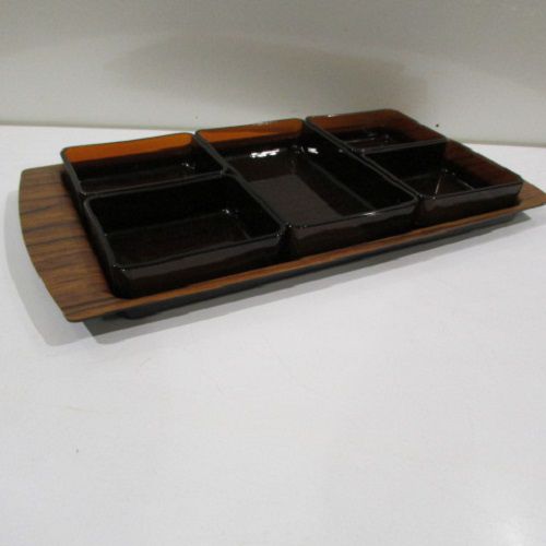 Service à hors d’œuvre ou à apéritif , plateau en bakélite et 5 coupelles en verre brun carrées , des années 50.