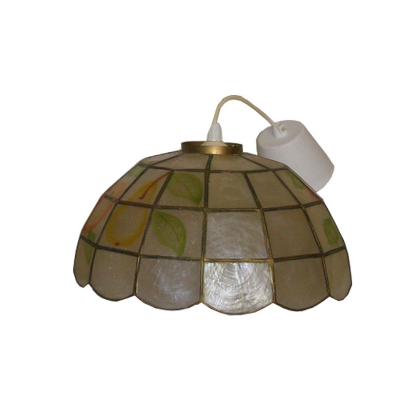 Lustre en nacre des années 1950, avec système d'accroche et embout pour ampoule à visser.Les facettes de nacre sont reliée par un entourage métallique, et le lustre est décoré avec des motifs de fruit et de feuilles, en tons pastel et transparents.
