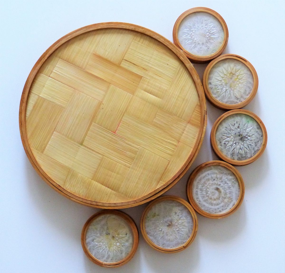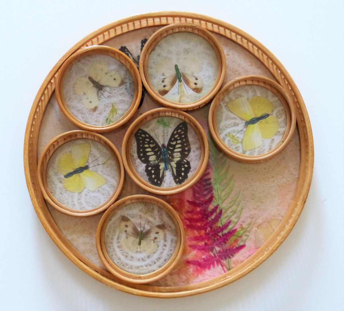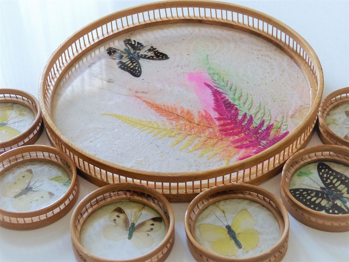 Plateau rond et 6 dessous de verre en bambou avec décor de papillons et de feuillage colorés, véritables ailes de papillons Années 60