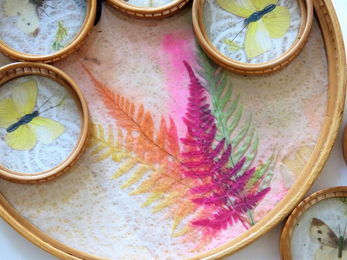 Matériaux : bambou, plastique et papier, ailes de papillon pour le décor.