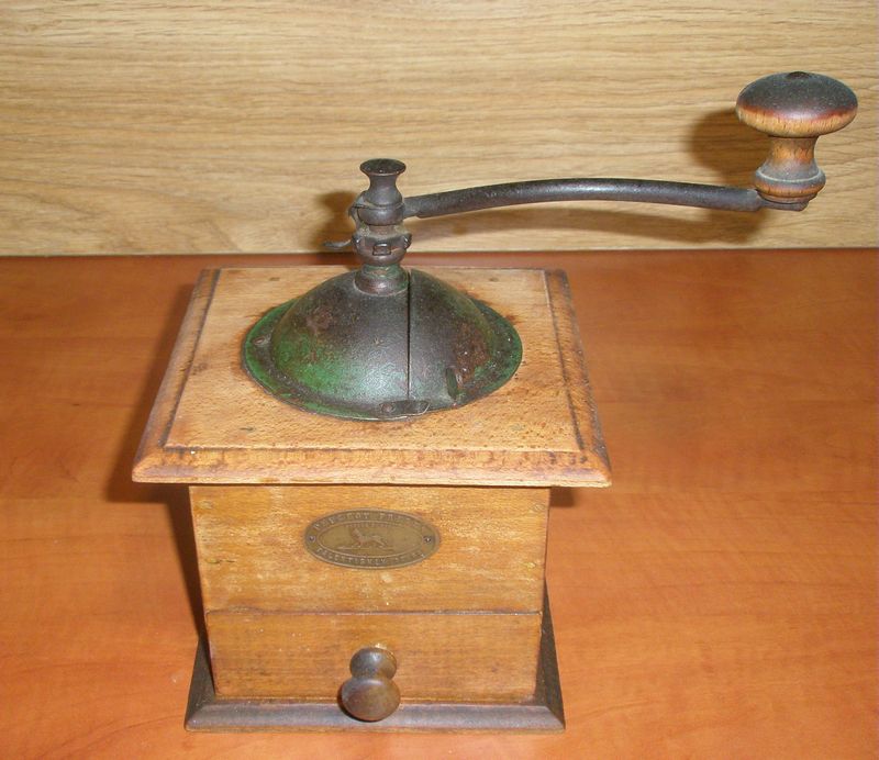 Moulin à café des années 50, portant l'inscription : ""Peugeot frères, Valentigney (Doubs), modèle déposé"". En bois et métal, tous les éléments sont fonctionnels.