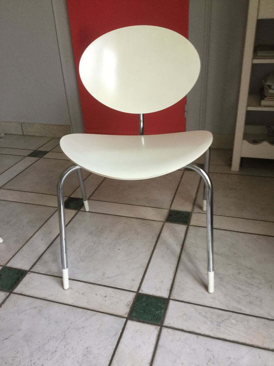 4 chaises coloris blanc, pieds chromés, dim assise 49 x 40, dim dos 31 x 44, achetées en 2004, bon état, quelques coups sur le bas des pieds et une décoloration sur une des assises peu visible (voir photo) visibles à Arras 62000