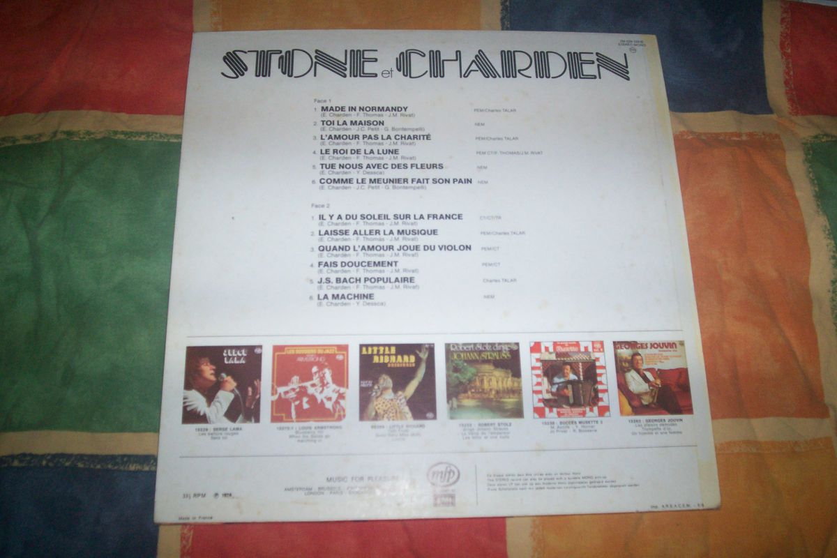 disque 33 tours 12 titres de stone et charden pochette et disque comme neuf voir les titres sur dos de pochette photos jointes .