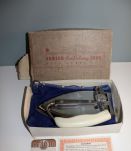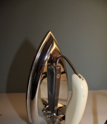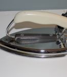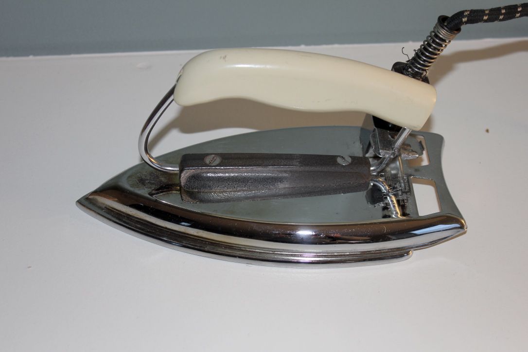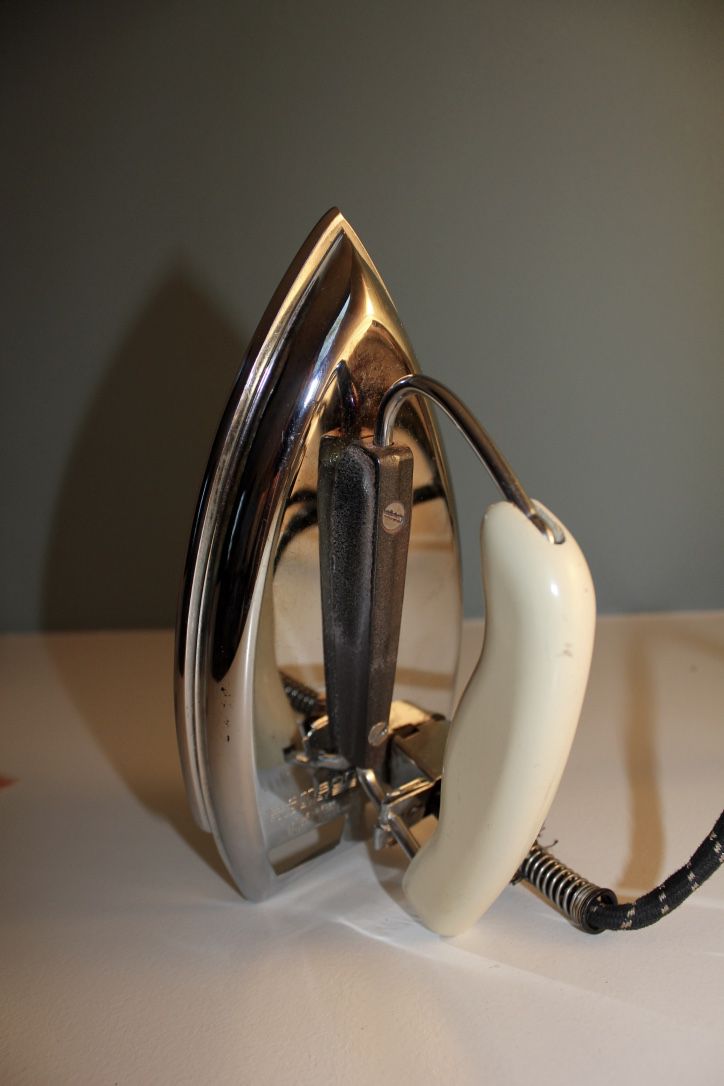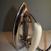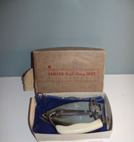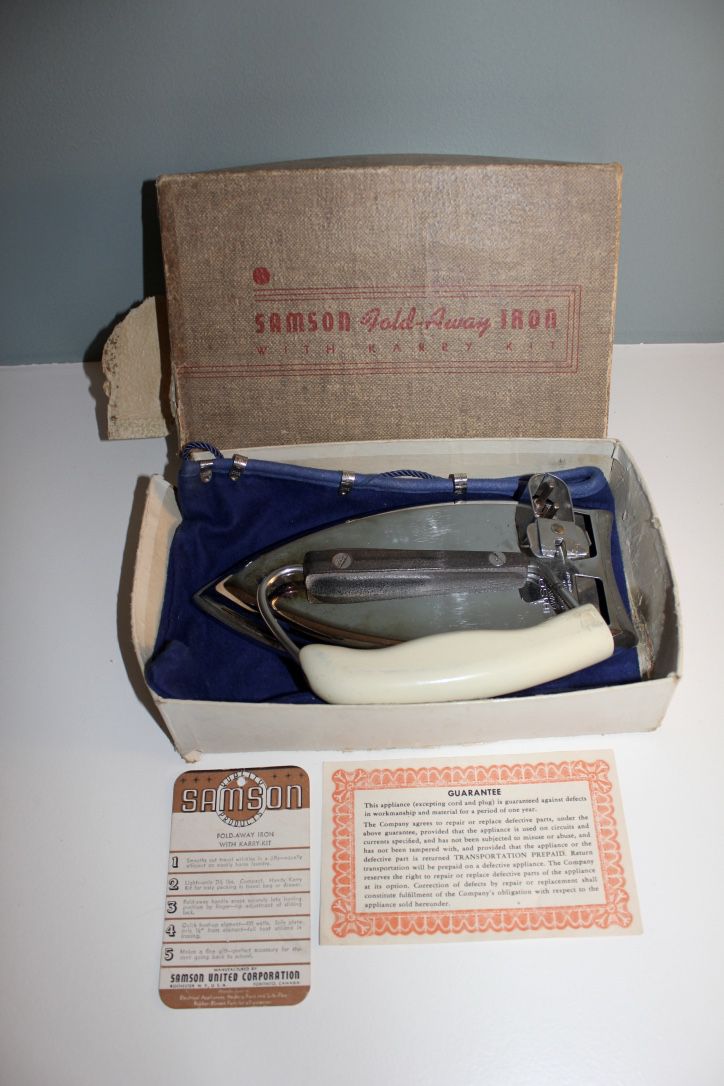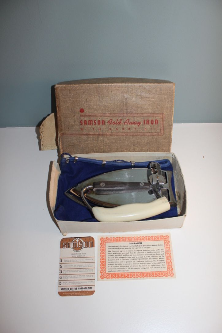 Voici un ancien fer à repasser de voyage de la marque américaine Samson Fold Away, accompagné de sa boite d’origine et de sa pochette de transport.