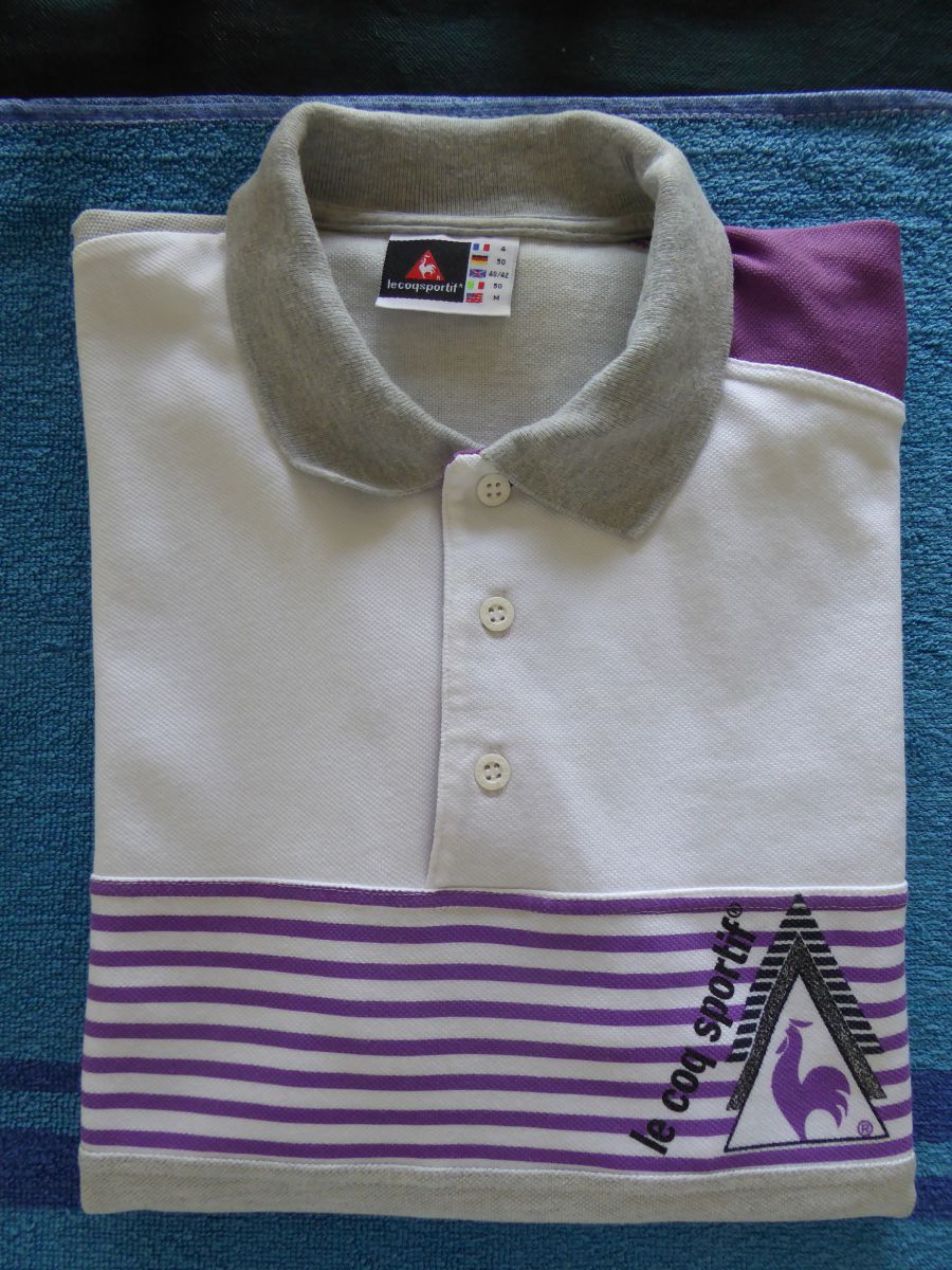 Polo Gris (M) neuf du CS vintage 1990 (TBE) : Polo avec le haut blanc et une bande grise rayé de bleu bleu, neuf, jamais porté de la marque COQ SPORTIF, taille 3 ou M des années 1990 (Prix 50€)