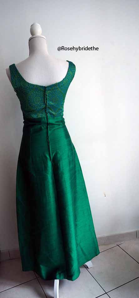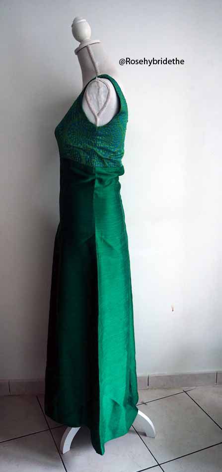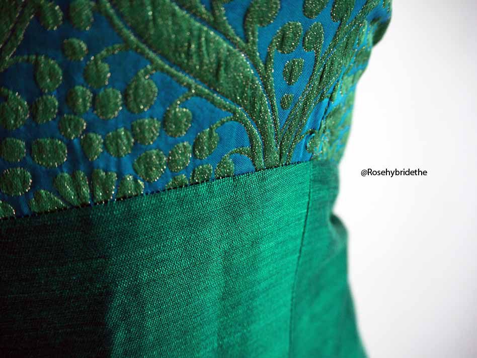 Le buste est turquoise avec des motifs brocarts pailletés. La jupe est de couleur verte.