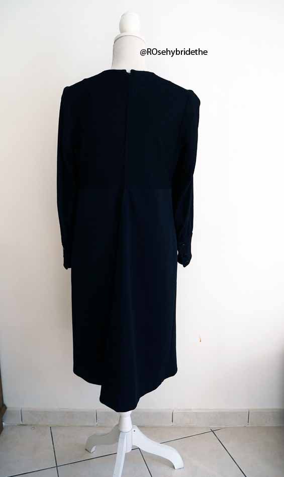 Cousue main dans un tissu synthétique, la robe ne comporte aucune étiquette de taille/marque/composition. Elle convient à une T38 (ou 36 avec un porté plus loose mais tout aussi mignon). Ses mensurations à plat :