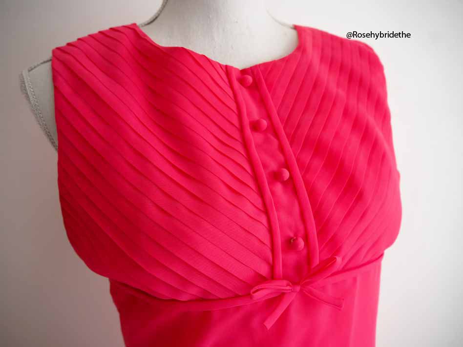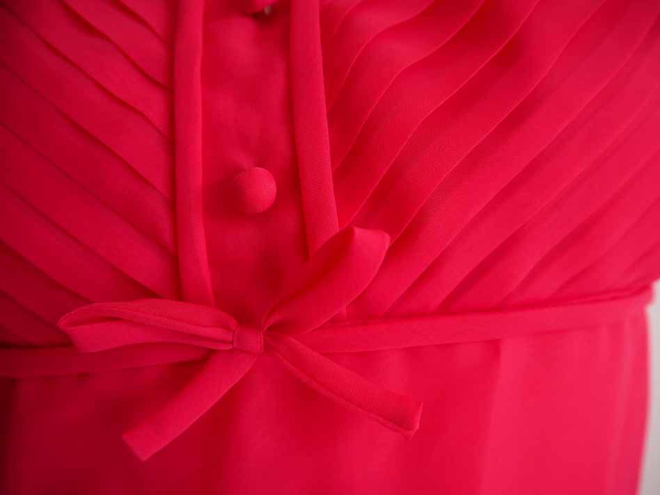 Jeu de plis sur le plastron, agrémenté de petits boutons décoratifs et d'un nœud sous la poitrine.