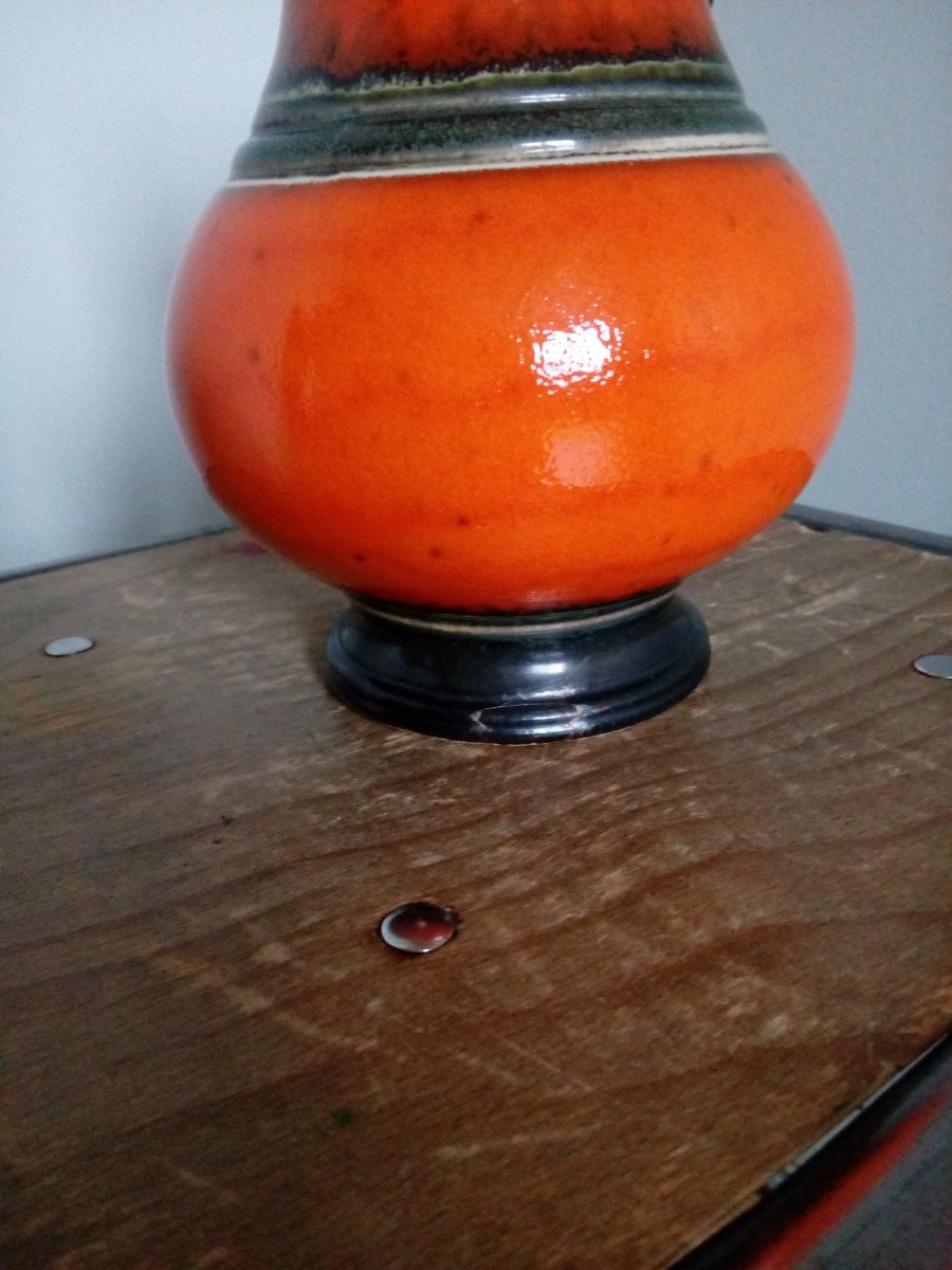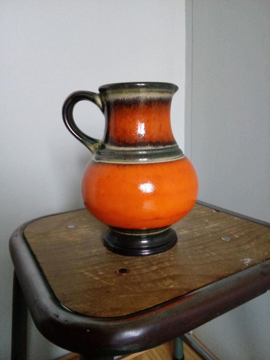 Ce joli pichet ou vase, en céramique (faïence émaillée) d'un bel orange et de « bandeaux » de couleurs sombres, date des années 60 ou 70 et vient probablement d’Allemagne de l'ouest. Les différents modèles de vase en céramique étaient produit en série, puis émaillés (décorés) par différents artistes. Ce qui donnait de nombreuses versions très différentes d'un modèle de vase. Ils comportaient dessous deux nombres moulés en creux, l'un correspondant au modèle, l'autre à la taille. Sous ce vase, en creux, l'inscription 1794/18 qui signifierait donc qu'il s'agit du modèle 1794 mesurant 18 cm. Ce pichet est en bon état, malgré un éclat recollé, au niveau du "socle" mais peu visible (Je ne l'ai remarqué qu'en prenant la photo du dessous). Il mesure 18 cm de haut, diamètre d'ouverture 8 cm, diamètre de la partie ventrue 13 cm environ. Il pèse environ 750 g.