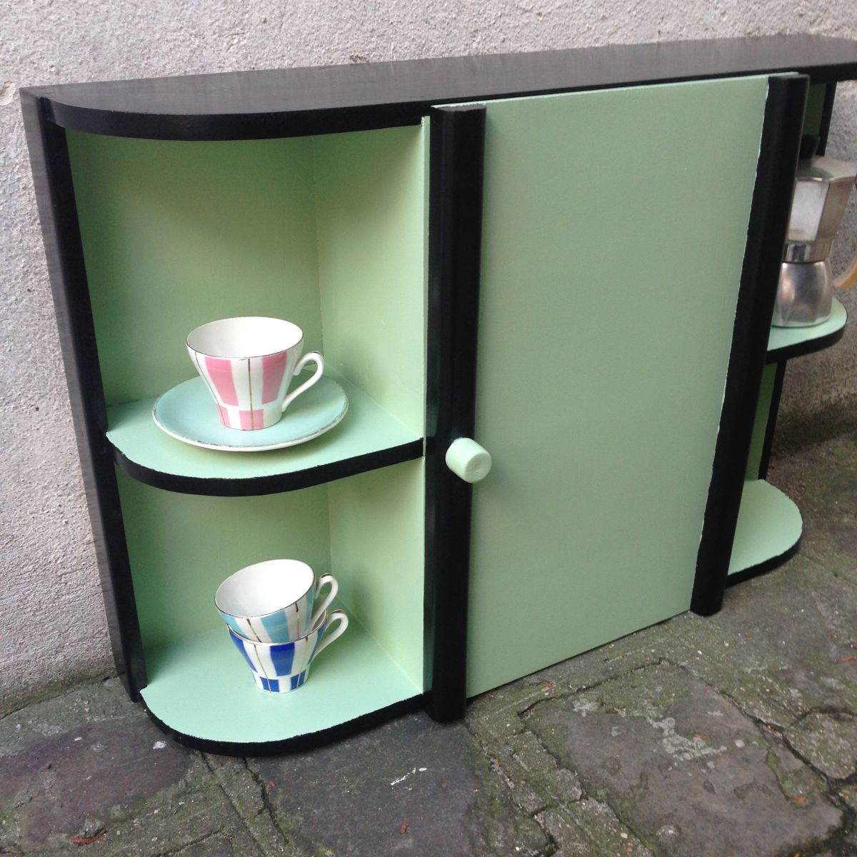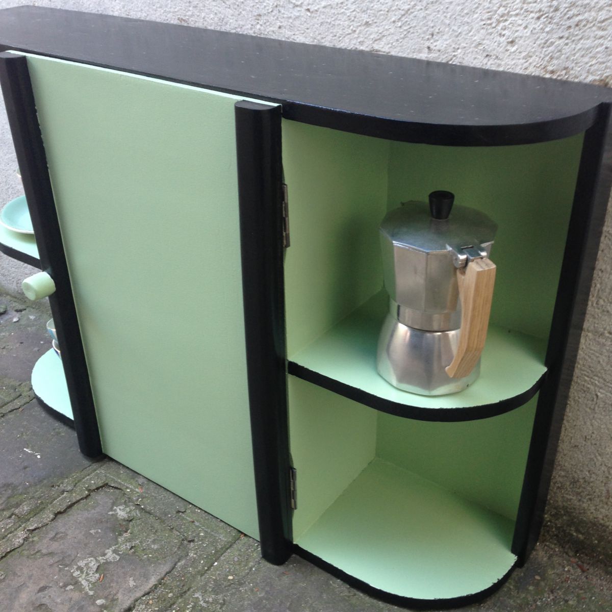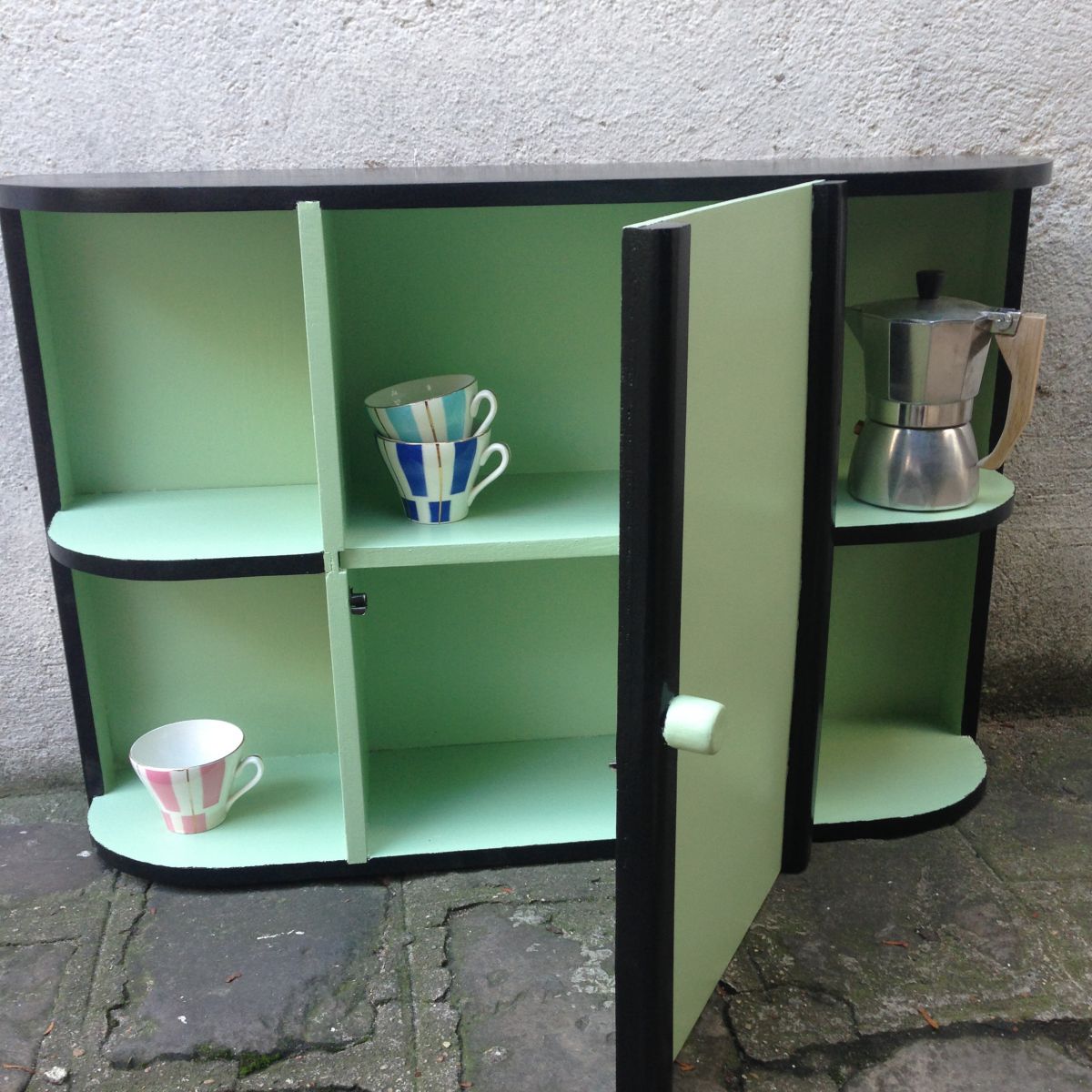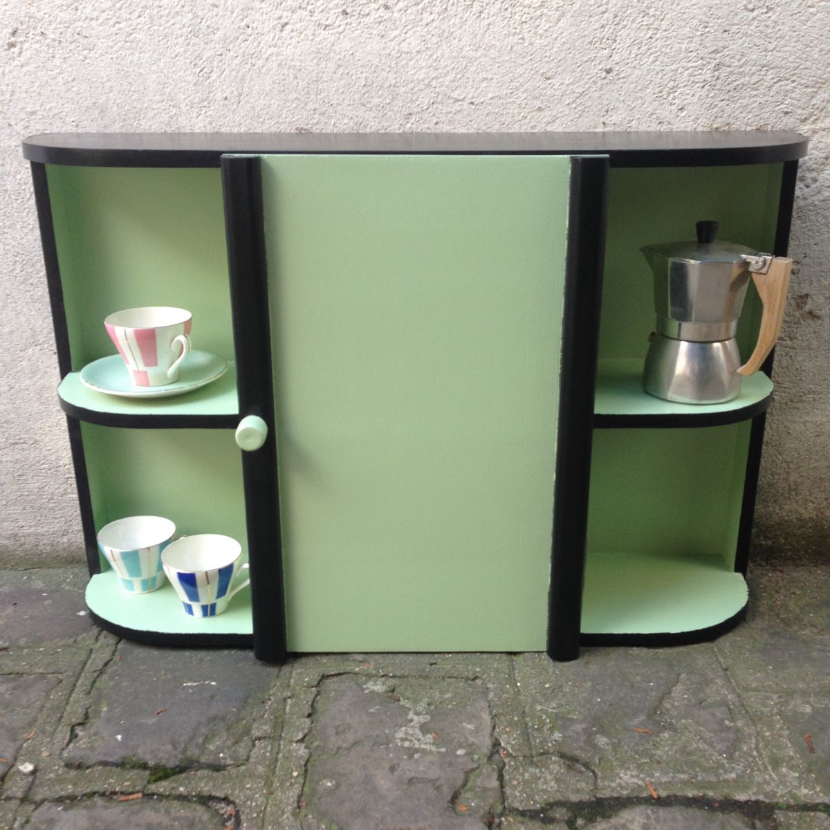 Armoire à pharmacie des années 60 peinte en vert amande et noir qui lui donne un coté très rétro.
