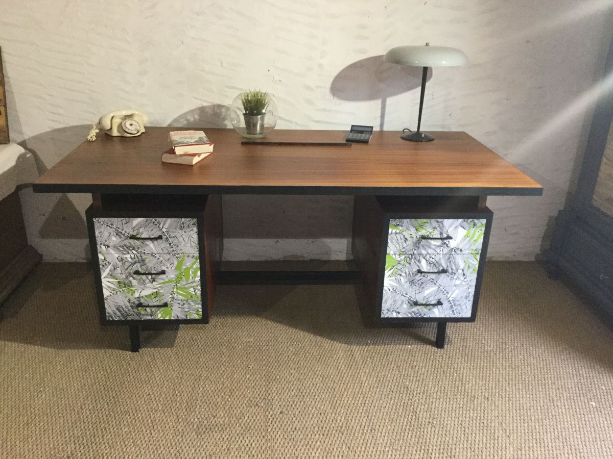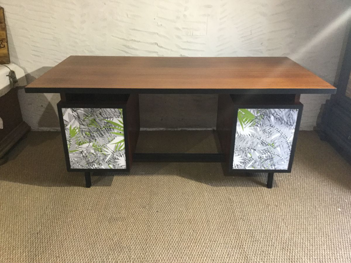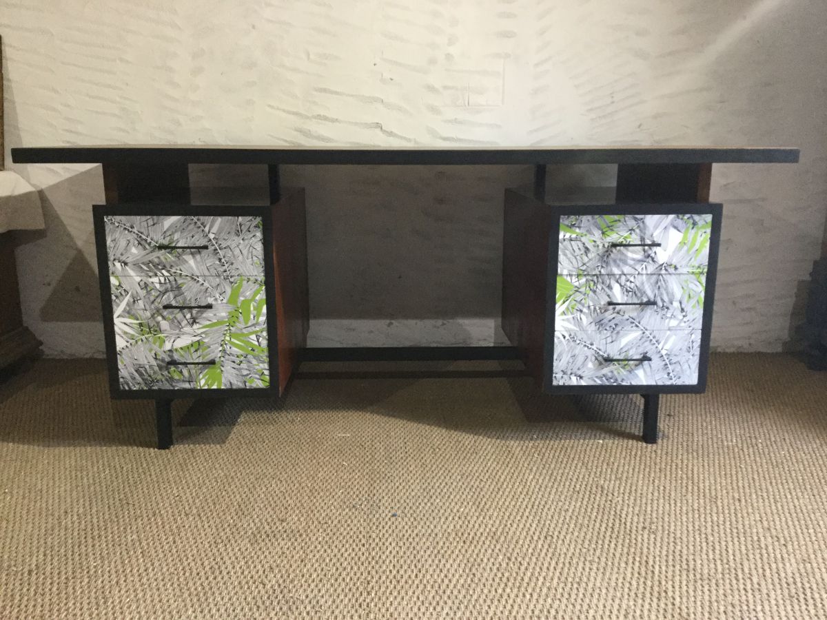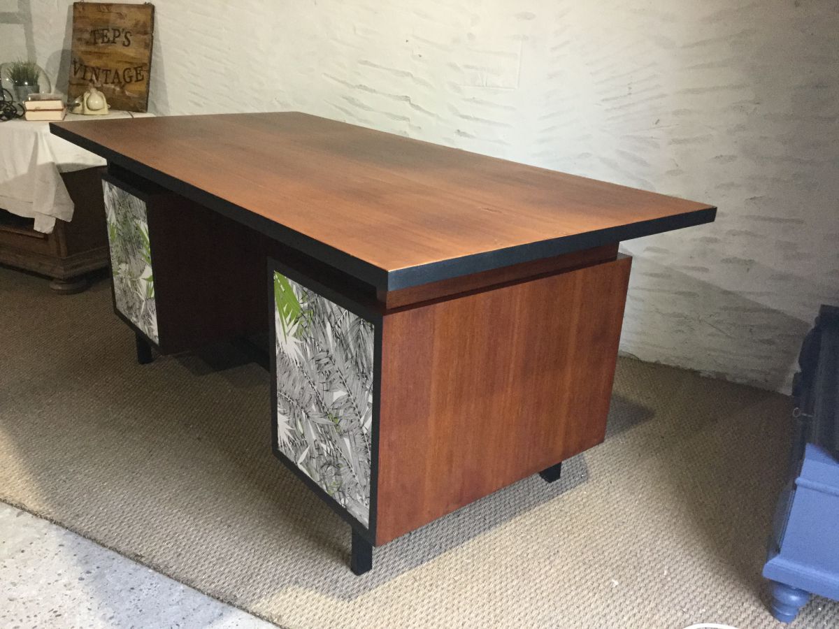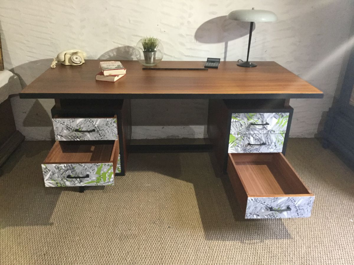 Bureau de direction vintage revisité, plateau bois vernis, tranches noir mat, tiroirs agrémentés de papiers peints jungle Christian Lacroix.