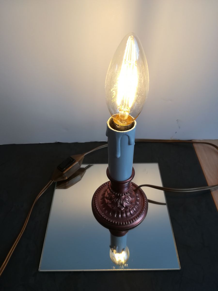 Elle est en très bon état de fonctionnement (ampoule à visser) et au niveau de l'esthétique il y juste un peu d'usure sur le haut de la "bougie" (voir photos)