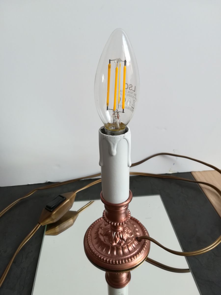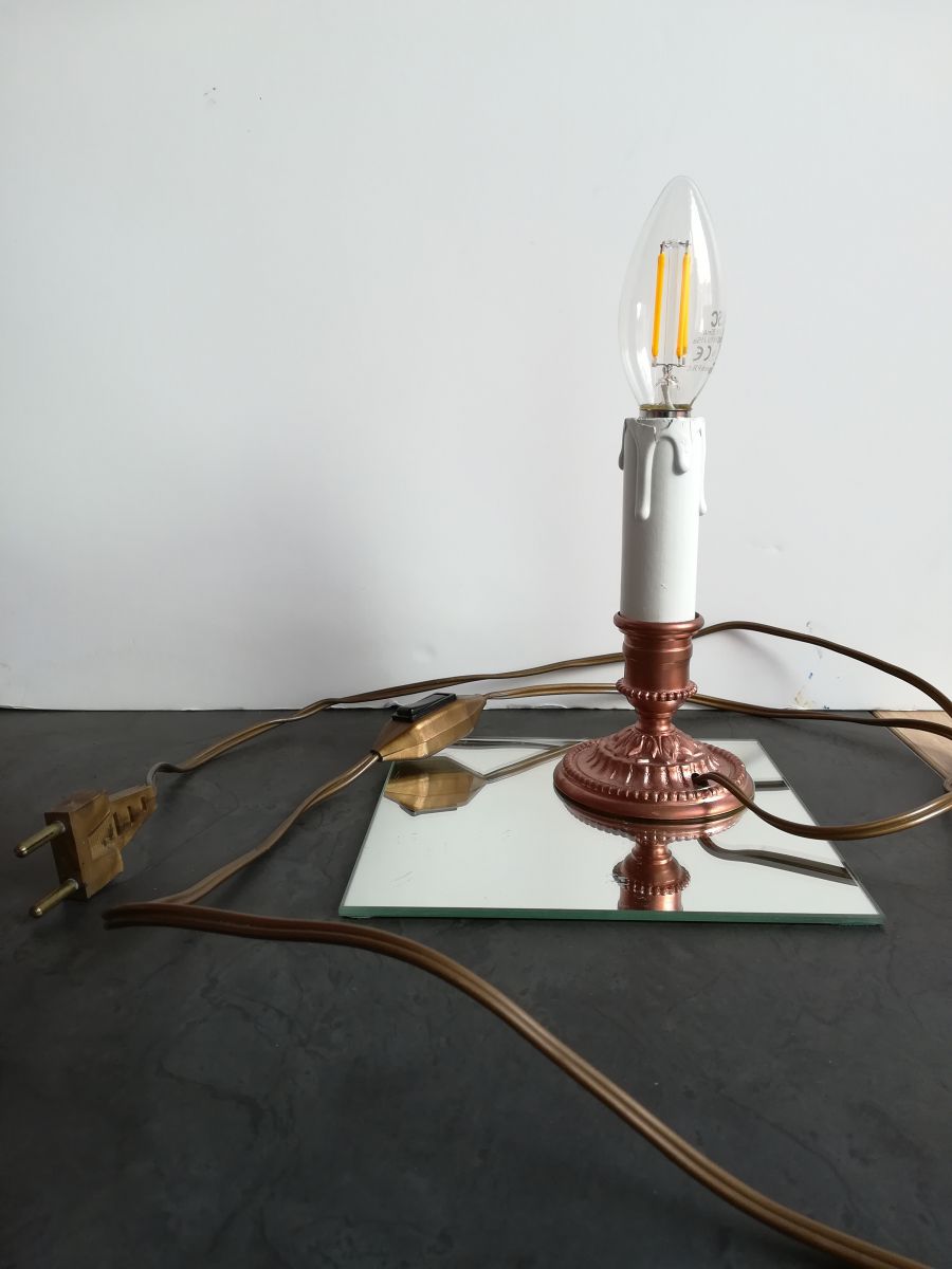 Jolie petite lampe en laiton vintage, bombé en cuivre sur le laiton et en blanc au niveau de la "bougie" qui était marron à la base!!