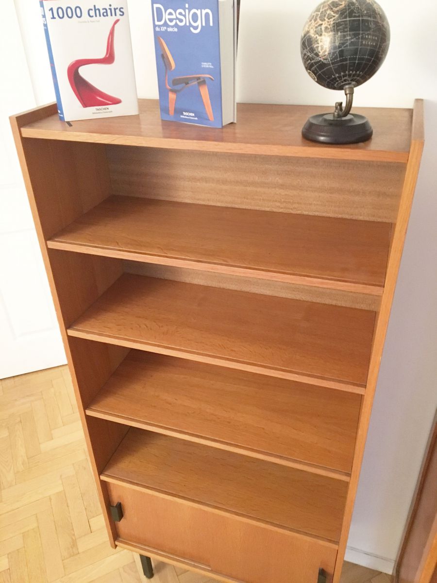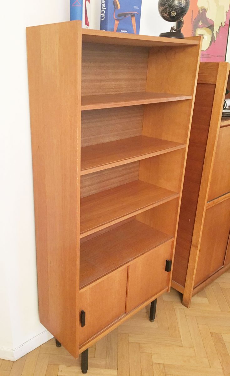 Superbe bibliothèque vintage des années 60 dans le style design épuré de Pierre Guariche avec ses pieds métalliques noirs.