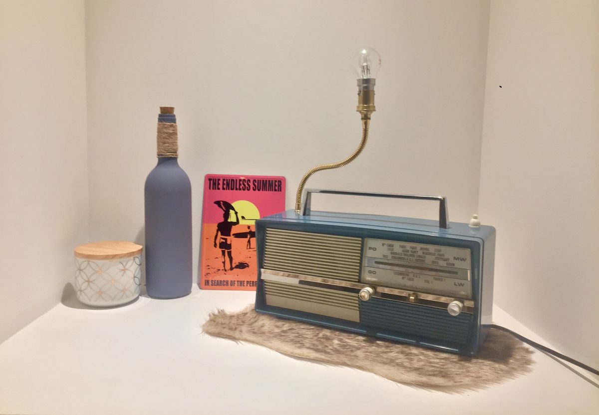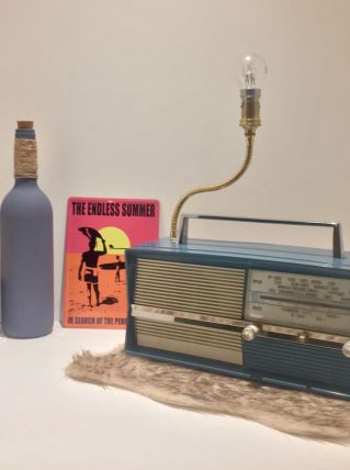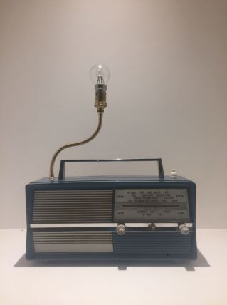 Détournement unique d'un transistor vintage aux couleurs intemporelles, cette lampe provoquera à coup sûr le sourire de celui qui la regarde.