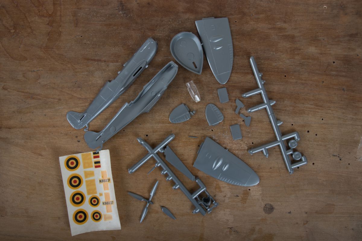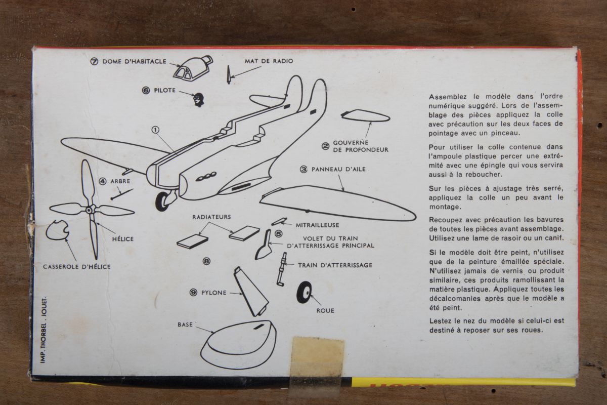 Maquette avion 23 pièces SPITFIRE IX à monter. Il ne manque que le pilote. Toutes les autres pièces sont présentes. Y compris les autocollants. L'hélice a une pale cassée qui peut être recollée.
