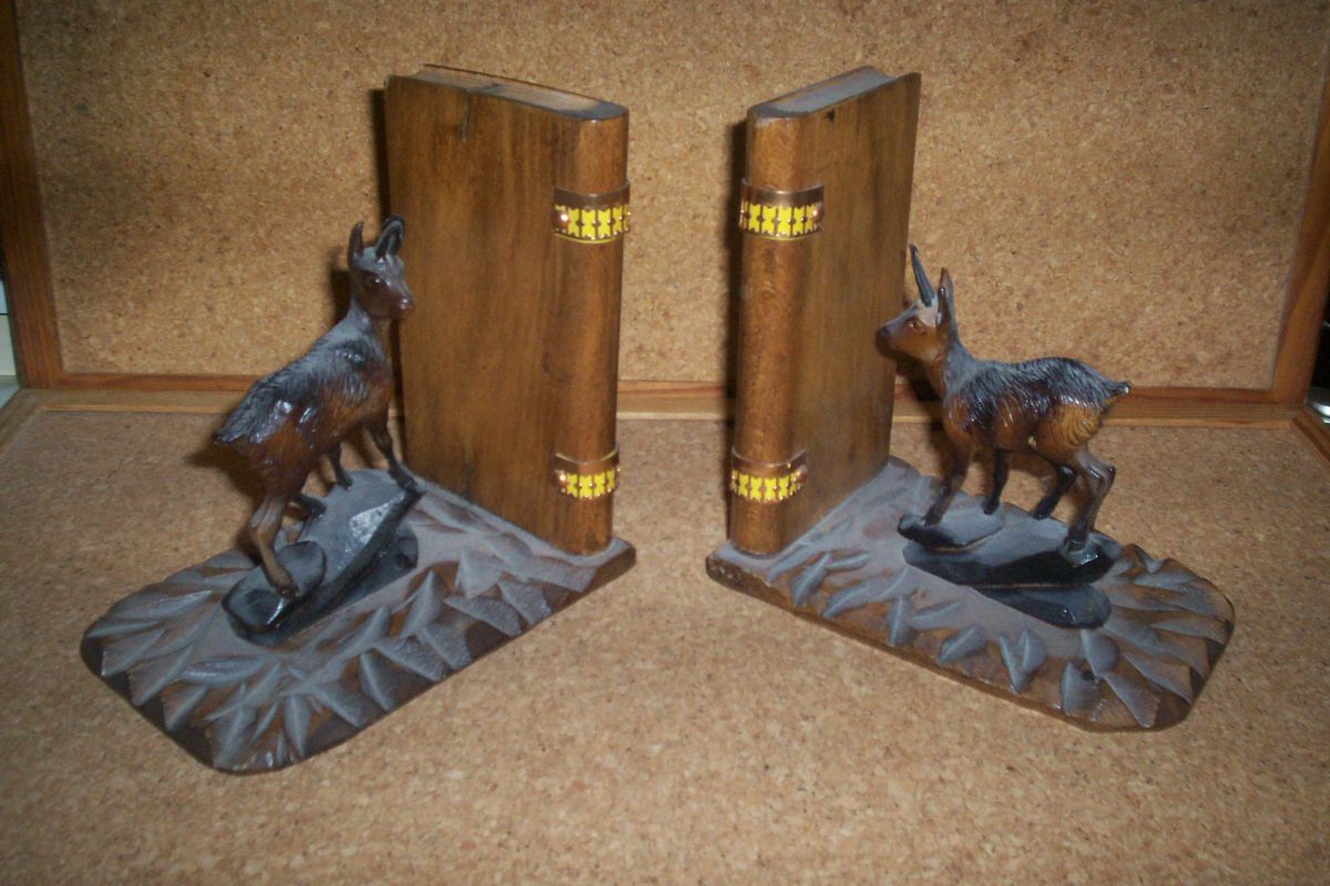 ancienne paire de serre-livres en bois en forme de livre et sculpté en bois avec bouquetin chevre de montagne en plastique dur objet de bibliothèque d'occasion et en bon état .