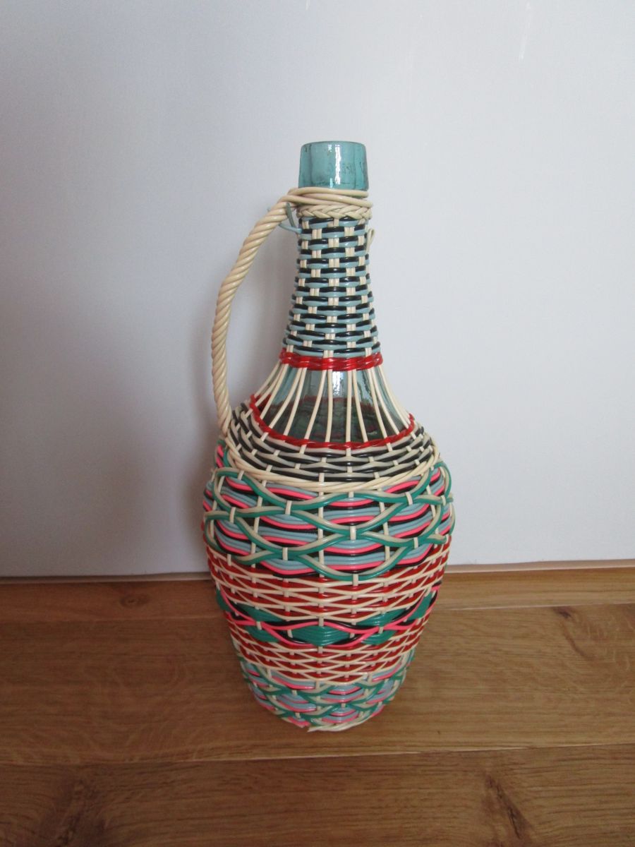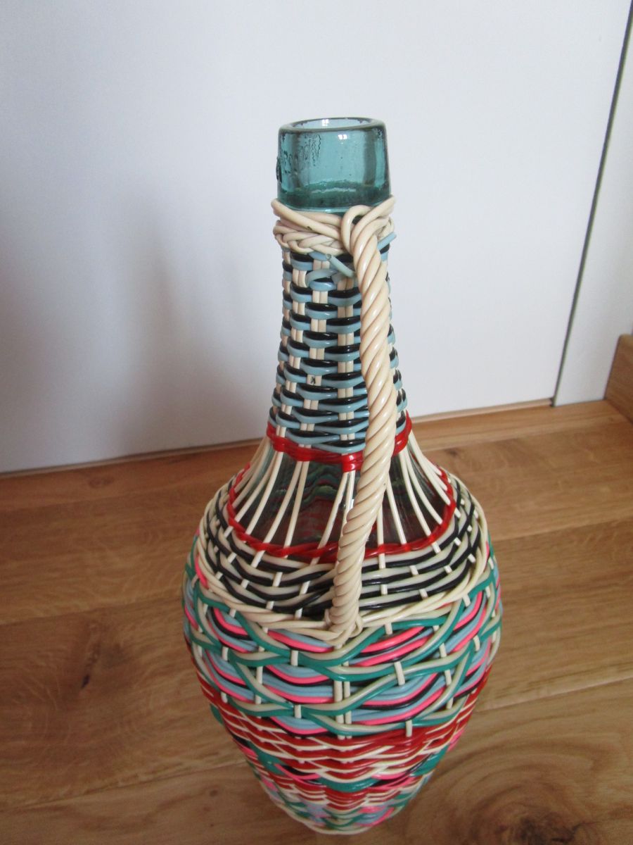 Jolie bouteille ou dame-jeanne en verre vert, marquée VIRESA sur le col et recouverte de fils « scoubidou » tressés multicolores (écru, noir, bleu ciel, rouge, rose, vert). Elle est en bon état général mais il semblerait qu'il lui manque le bouchon qui devait être attaché par les deux « bouts » de fil bleu ciel qui dépassent sous l'anse. Deux brins présentent une cassure (un brin noir sur le corps, et un blanc au niveau du bas de la bouteille), mais c'est très peu visible. Elle mesure 35 cm environ de haut, environ 15 cm de diamètre maximal et 10 cm de diamètre en bas. Elle pèse 1100 g environ.