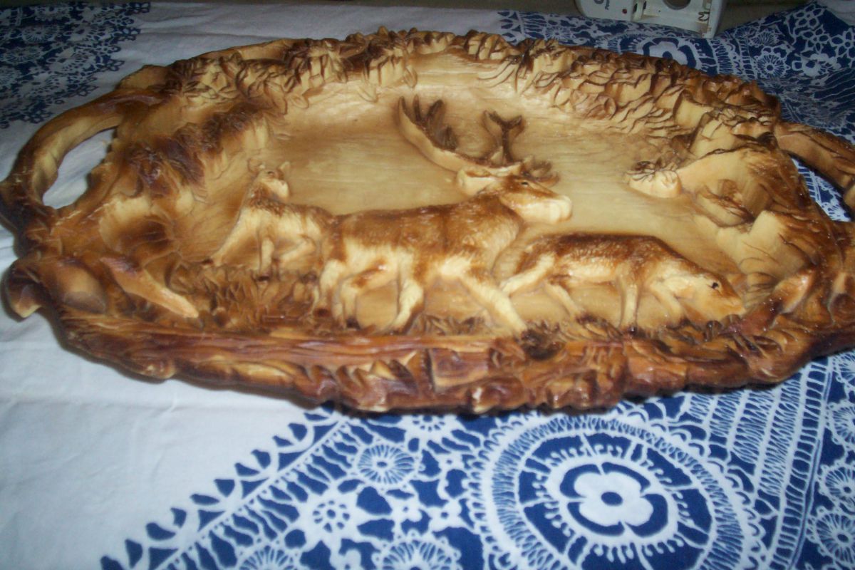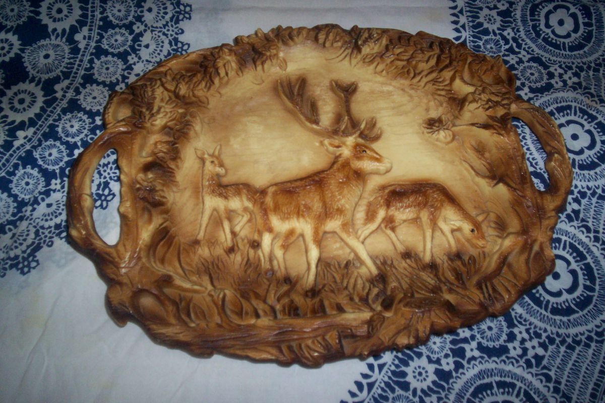 plateau de table en plastique dur imitation bois et decor foret theme chasse objet année 1960 d'occasion en très bon état