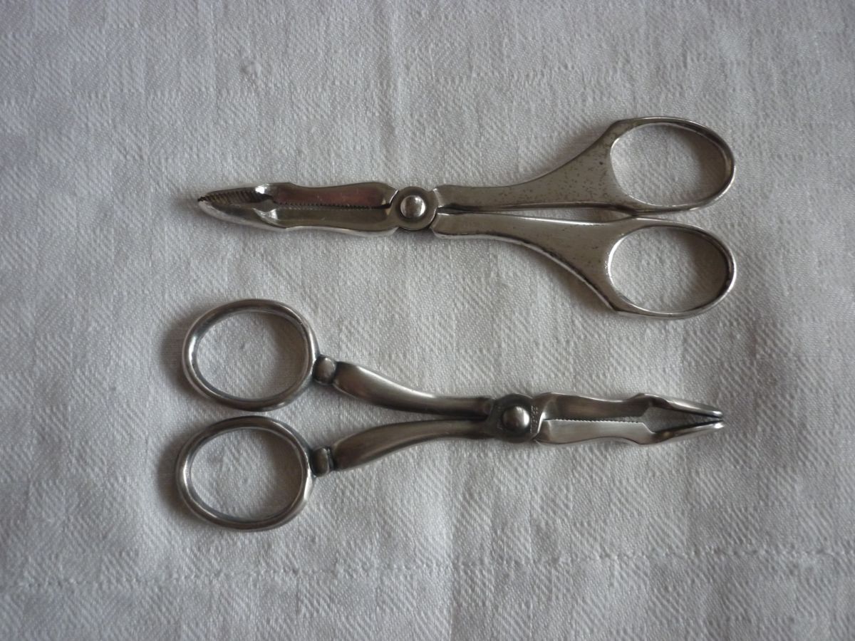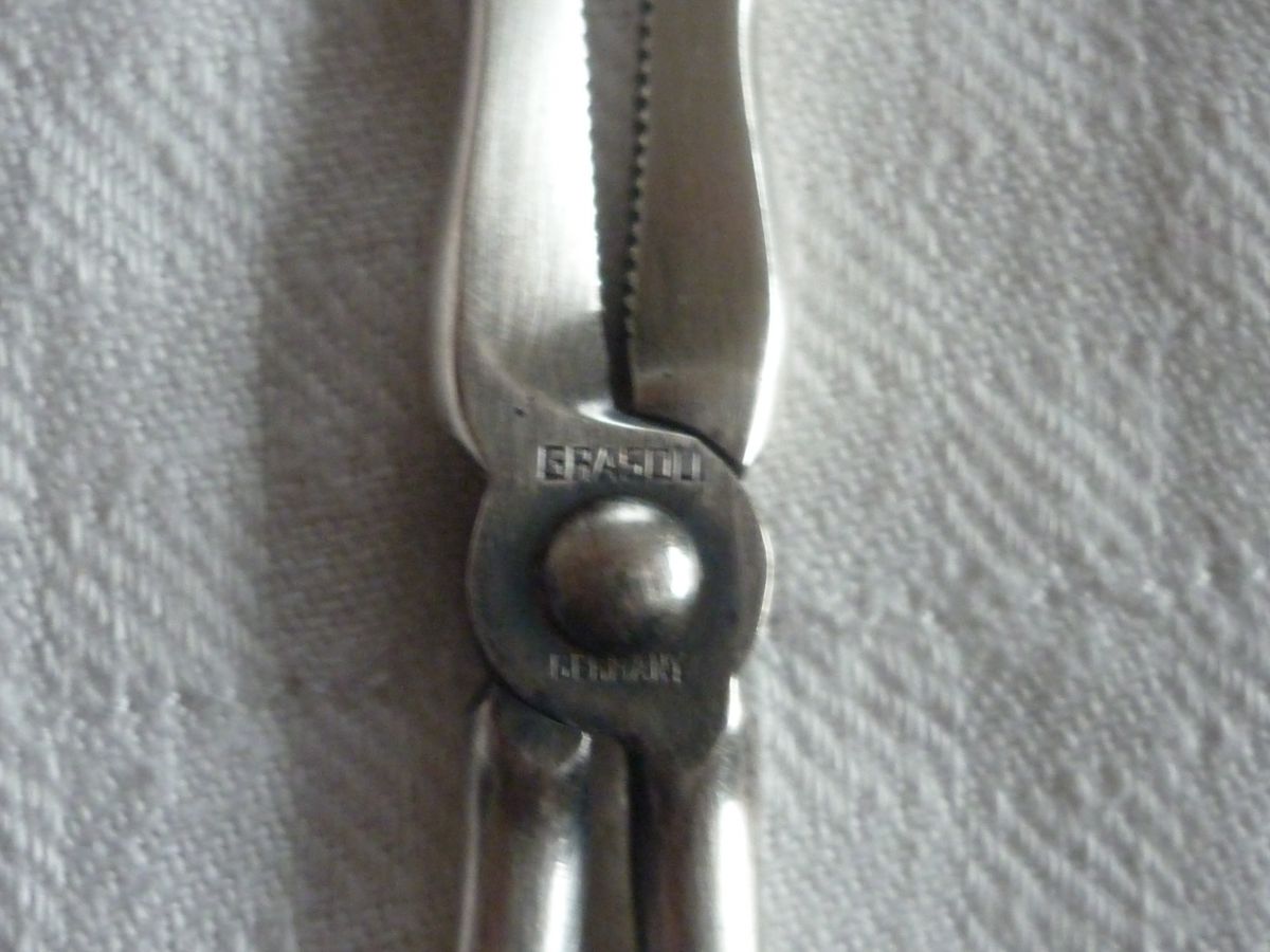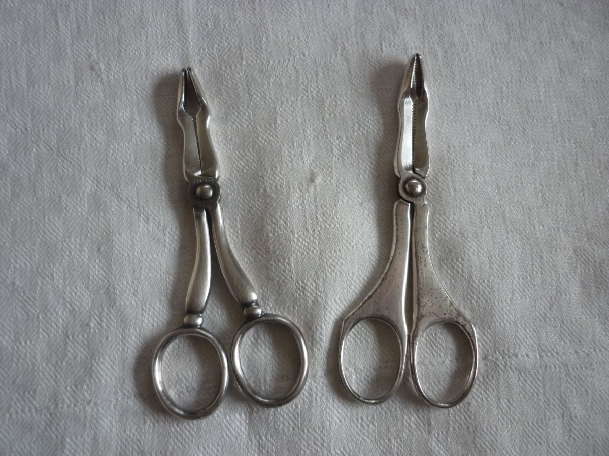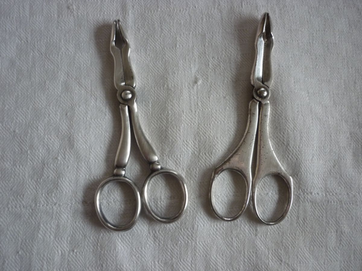 2 ciseaux en metal argenté(modeles legerement differents) faisant office de pince a sucre dont 1 poinçonné Grasoli Germany:longueur 11cms:a noter que celui non poinçonné a des points de piquage,l'autre est en bon etat