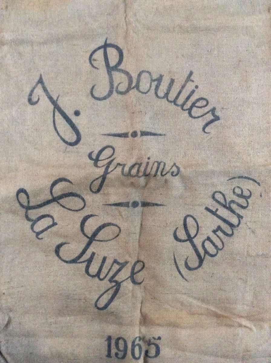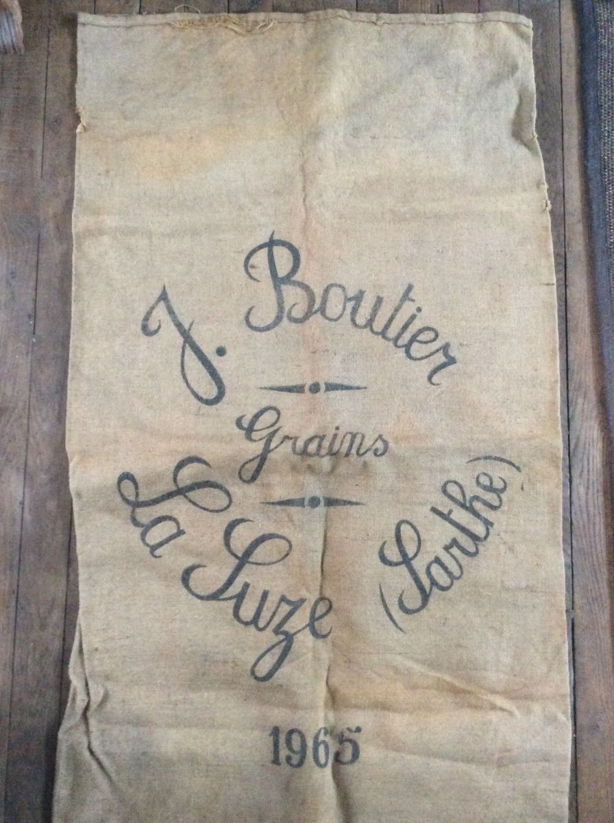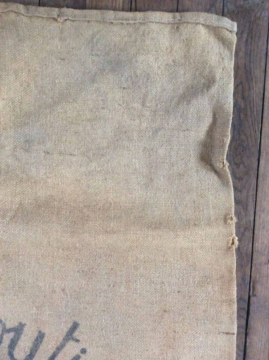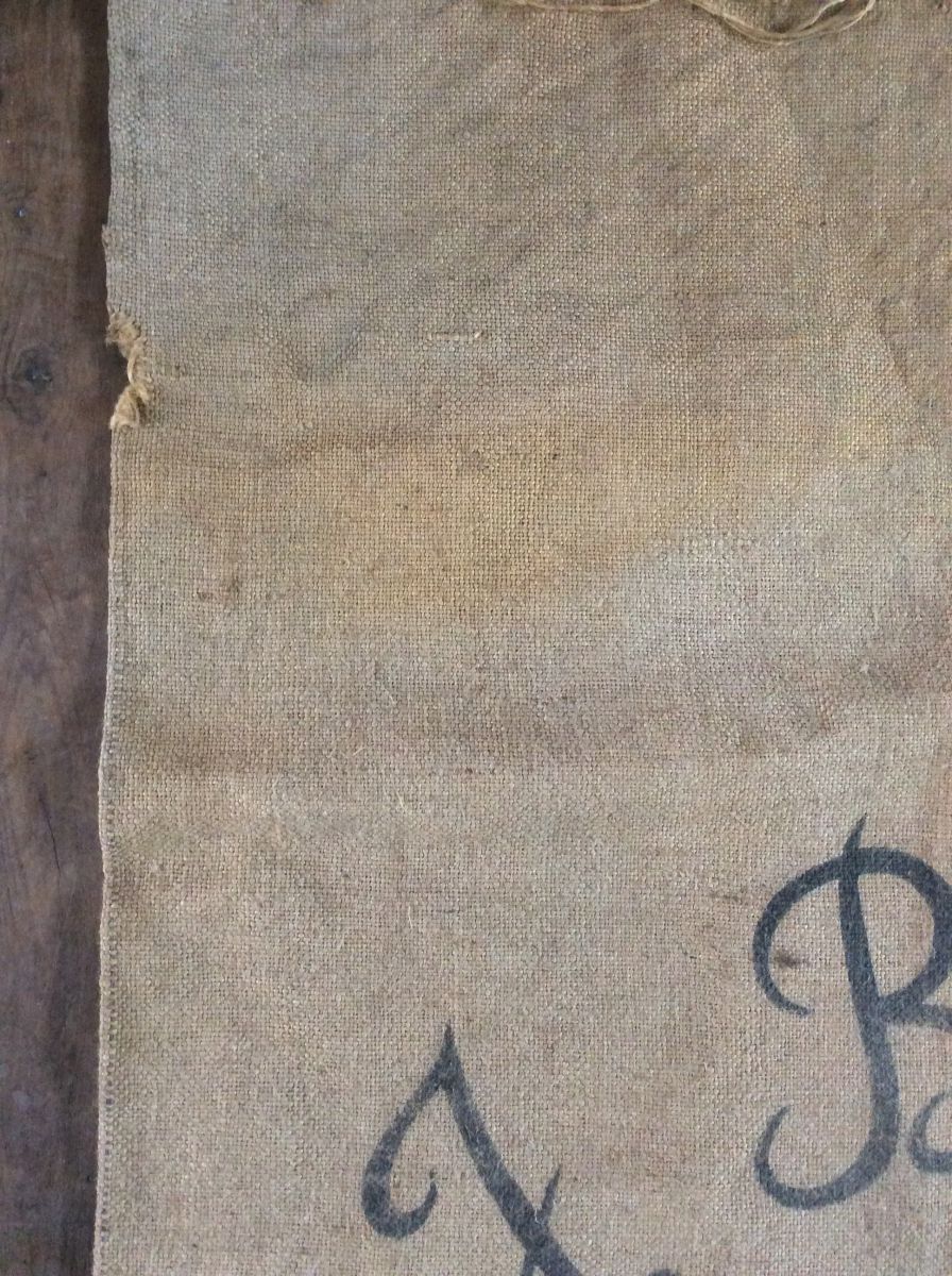 Beau et grand sac à grains en toile de jute . Ancien . Un trou en haut à gauche sur la pliure et trois petits sur la pliure de droite. Les inscriptions ne sont pas trouées. Vendu dans son jus.