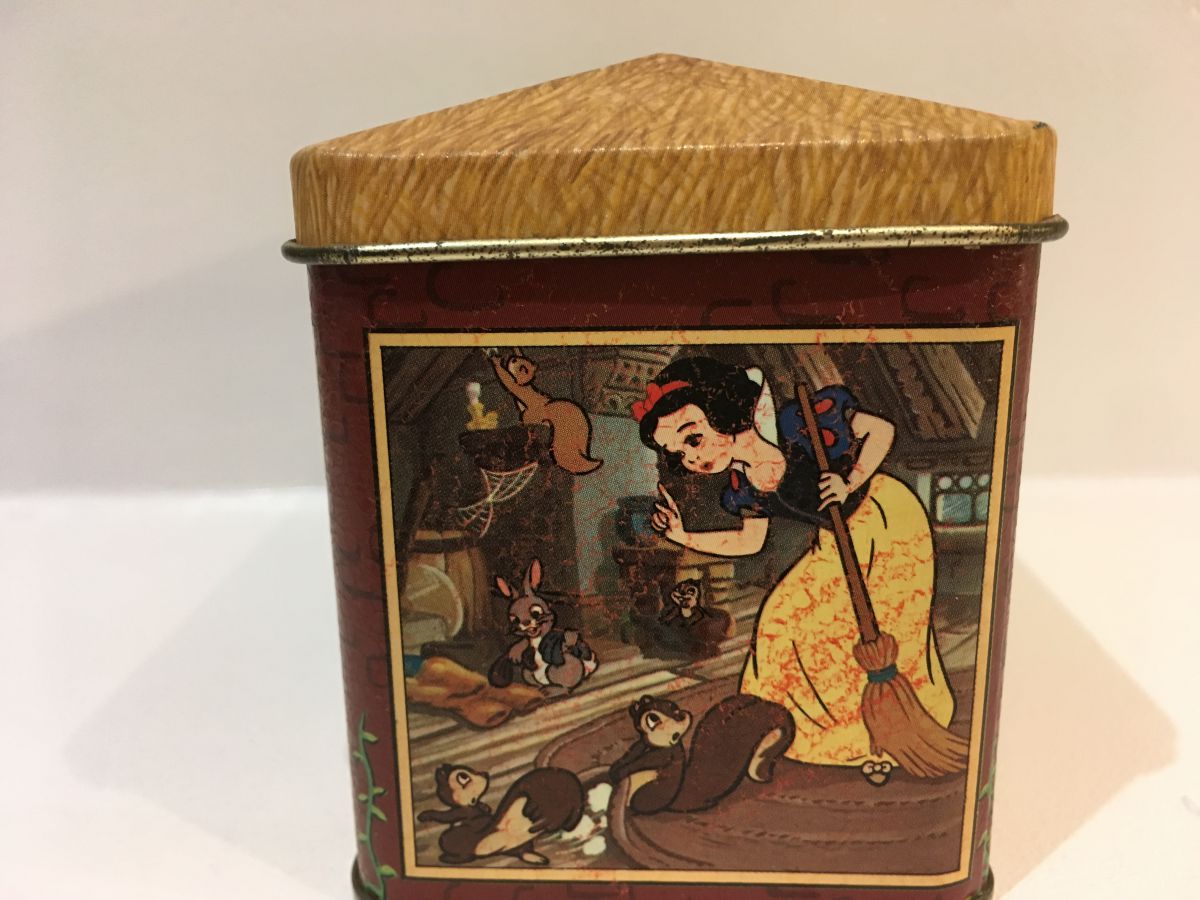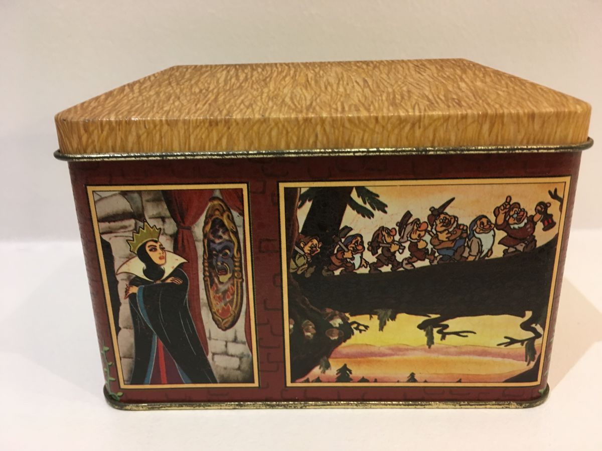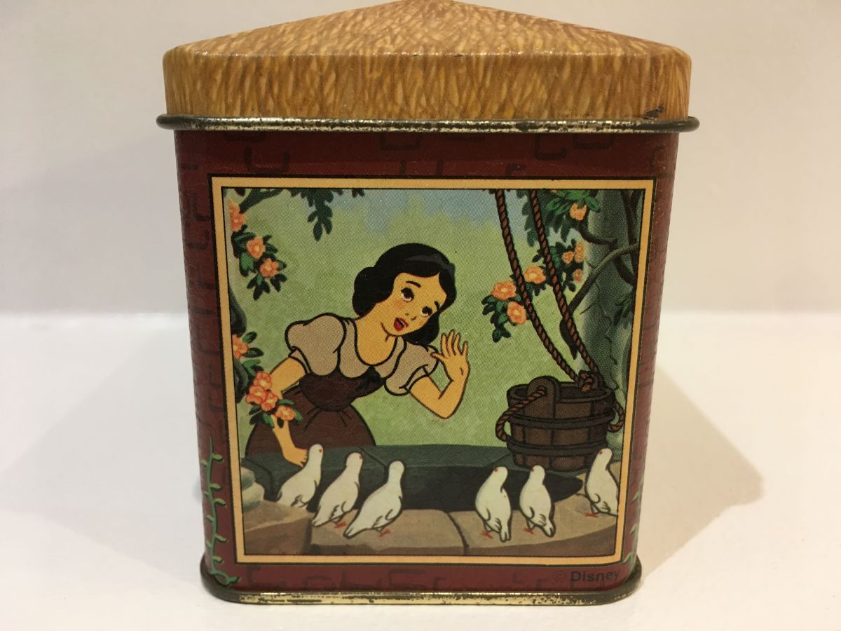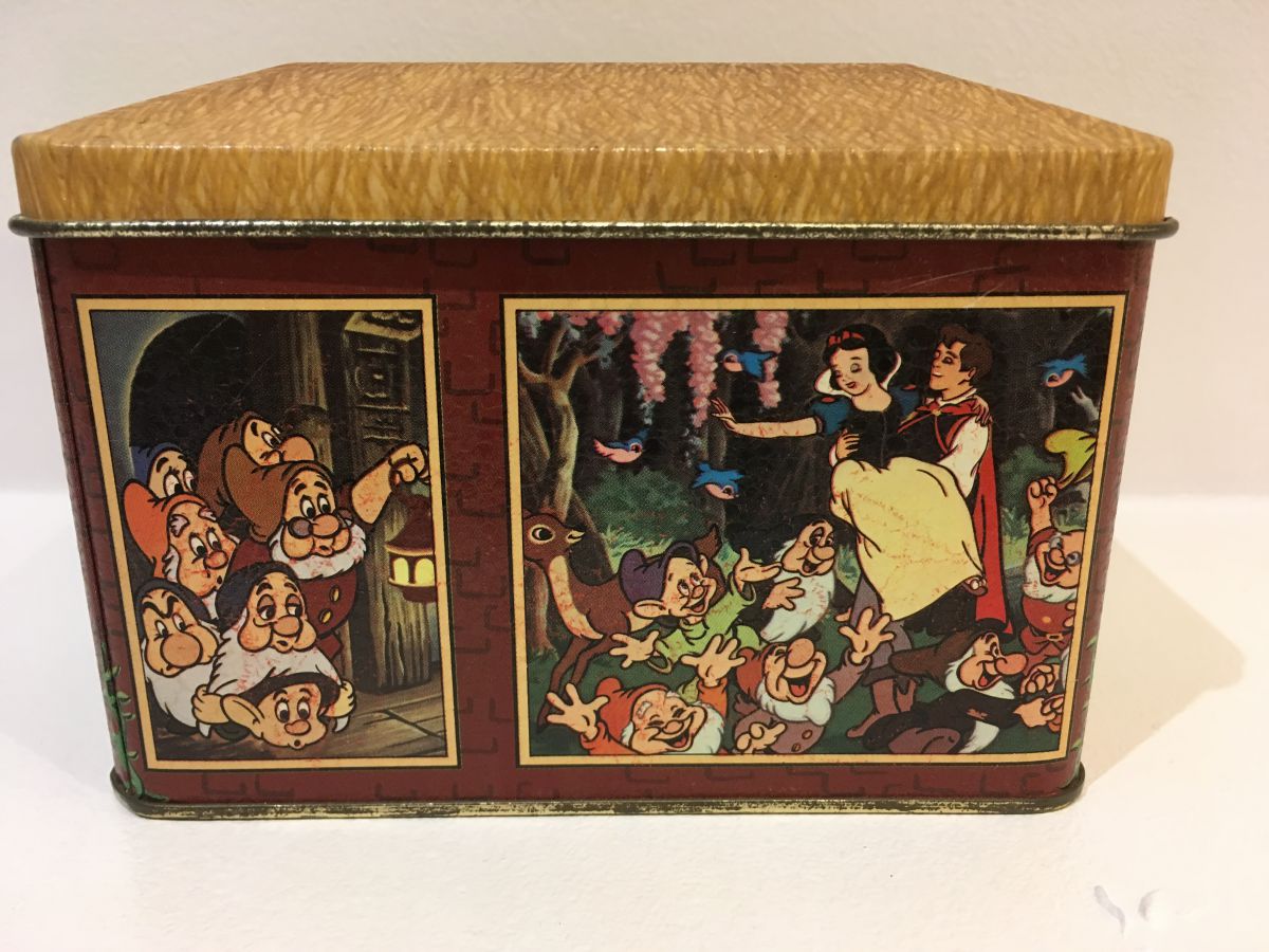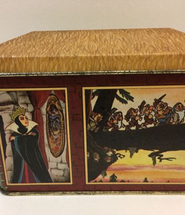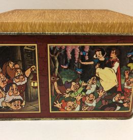 Rare. Jolie petite boîte en métal aux dessins sur les 4 faces de Blanche Neige et les 7 Nains.