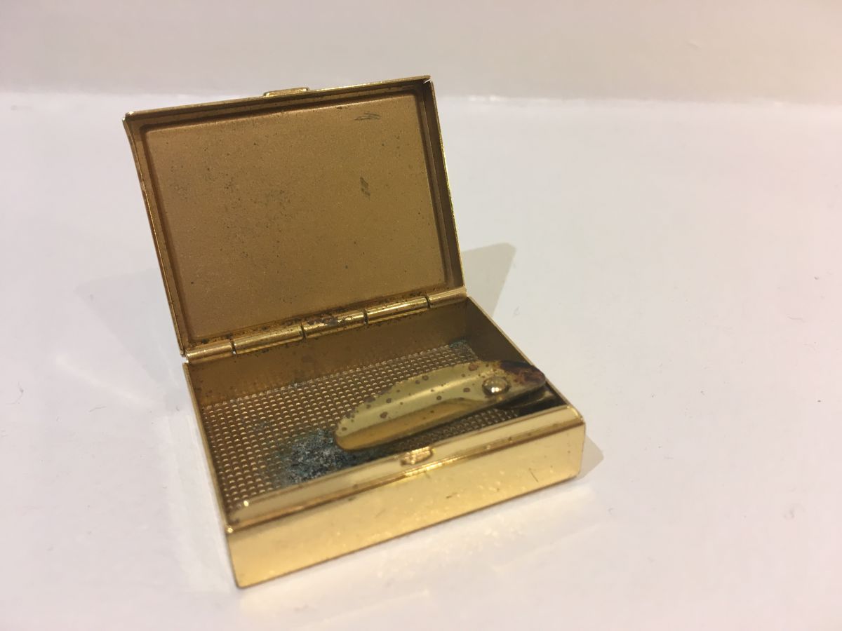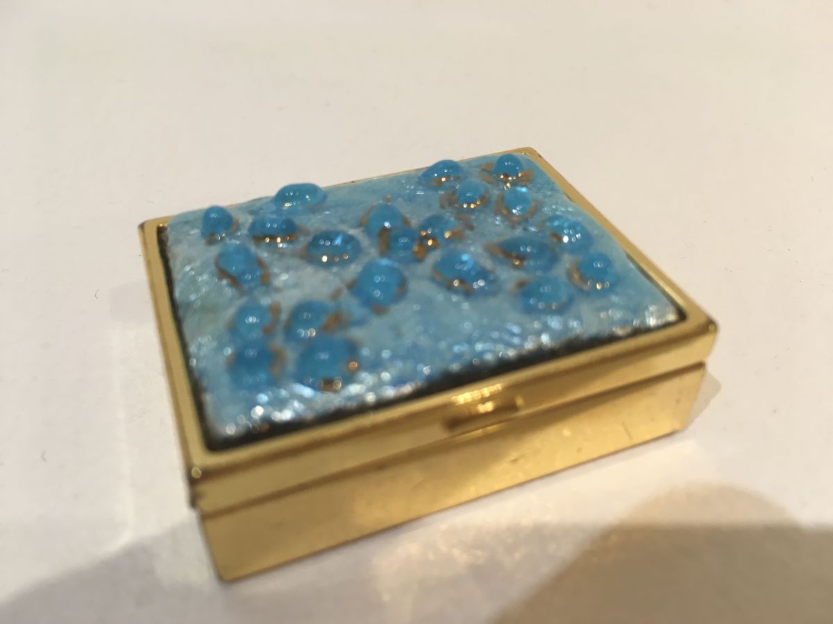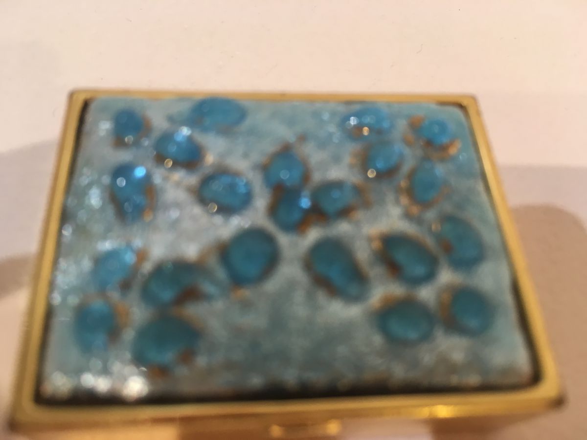 Adorable cendrier de poche. Avec repose cigarette. Décorée de petites pierres bleues.
