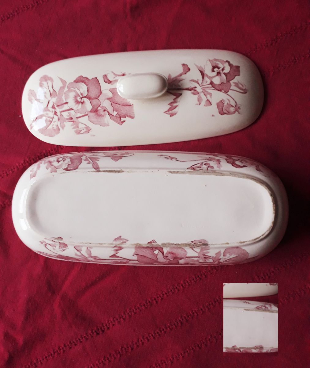 Très joli porte savon, beau décor de fleurs (pensées) en faience de Longchamp.