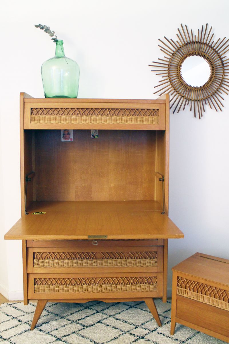 Secrétaire rotin pieds compas vintage