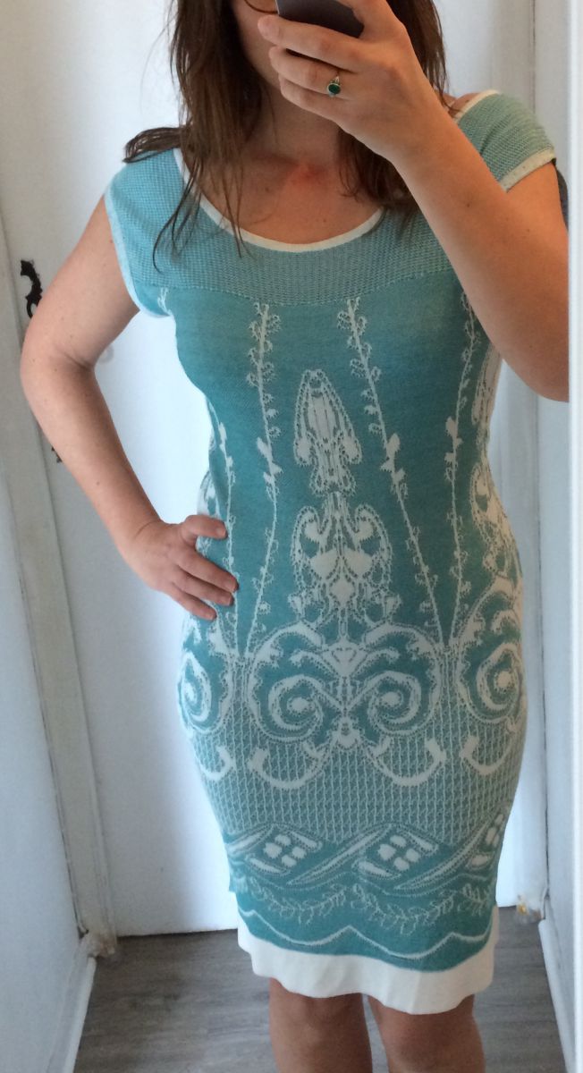 Robe en maille, blanche et turquoise, les boutons se portent devant ou derrière.