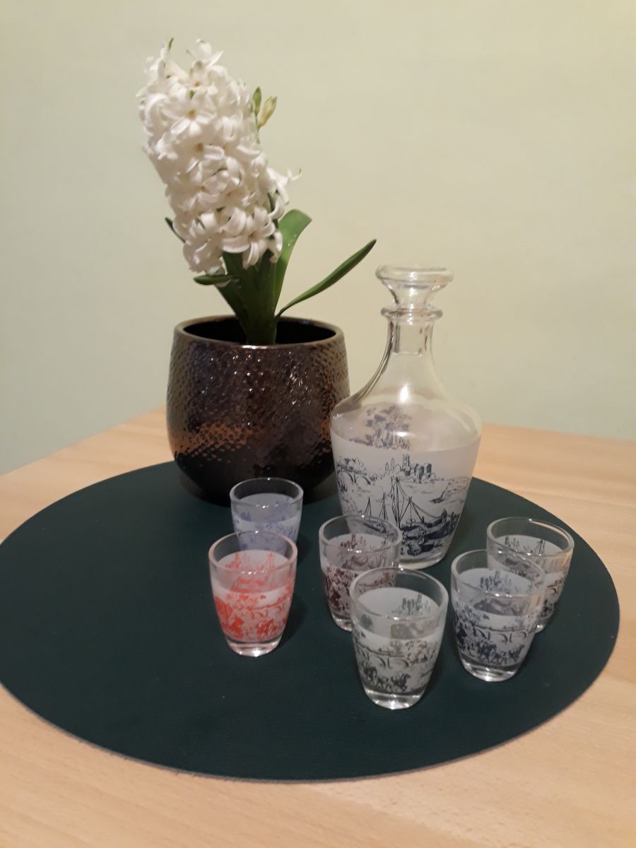 Carafon de 18cm de haut avec le bouchon et 6 petits verres de 5cm
