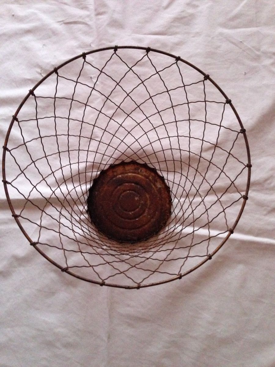 Ancienne poubelle en fil de fer tressé de style industriel dans son jus