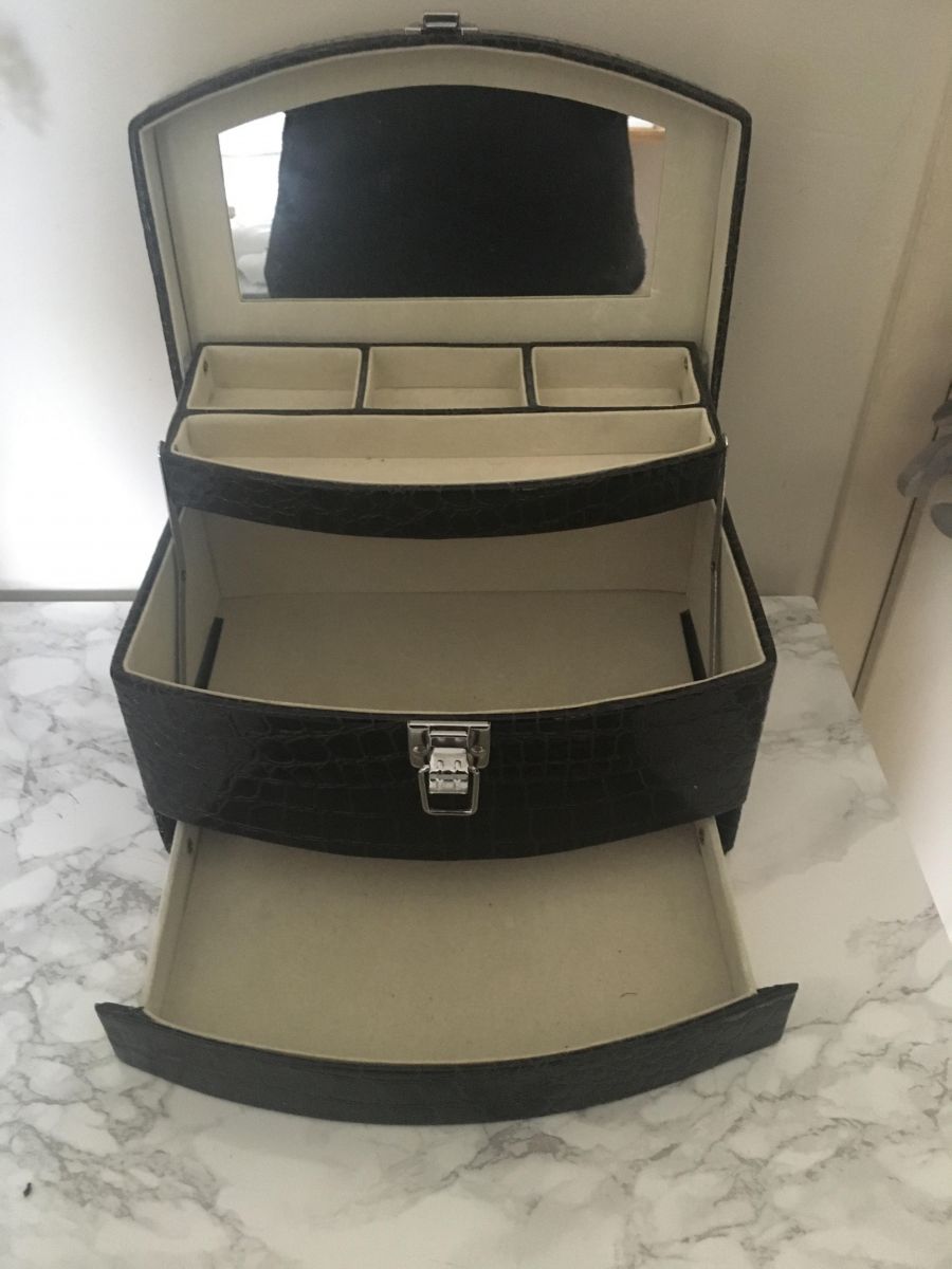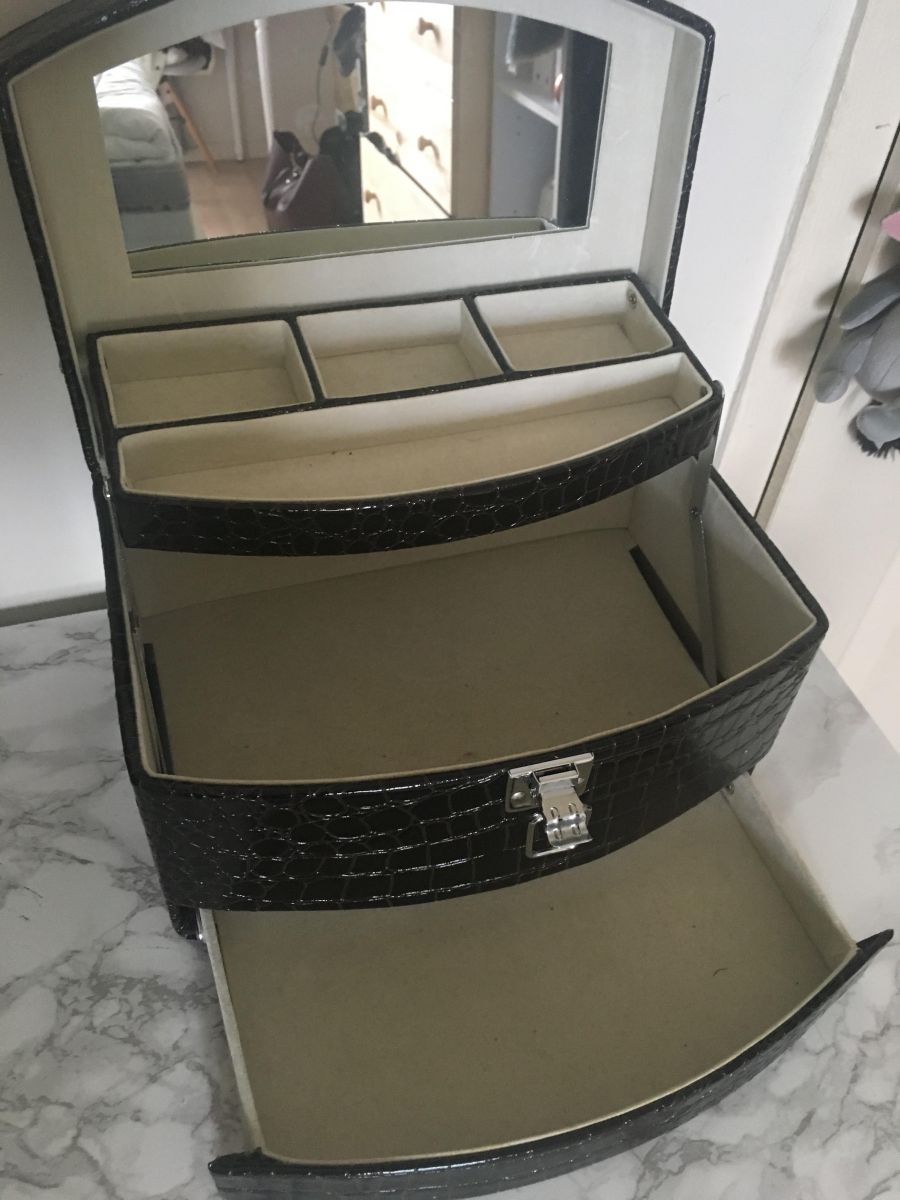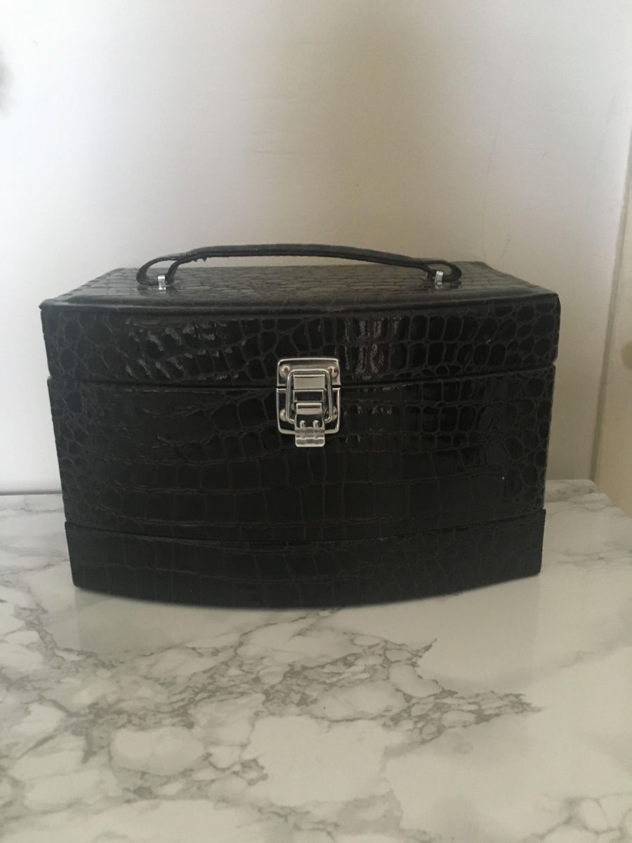 Boite à bijoux sur trois étages, transportable grâce à un poignet sur le dessus. De couleur marron imitation cuir et écaille de serpent.