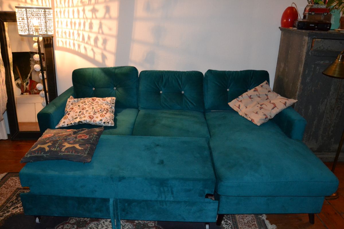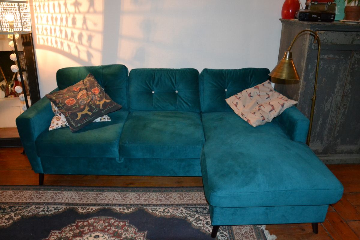 Il s'agit d'un canapé d'angle de la MARQUE BOBOCHIC - canapé scandi bleu canard - édition limitée.