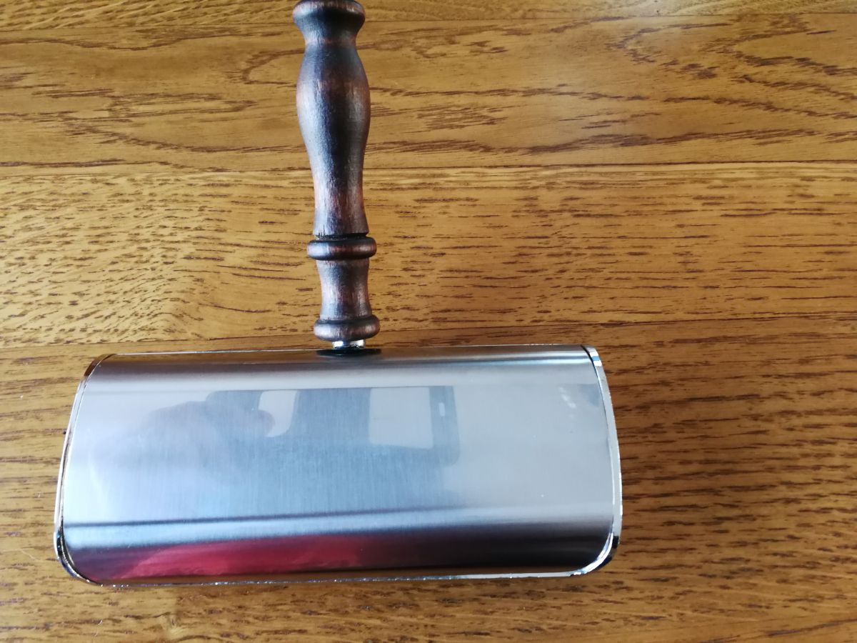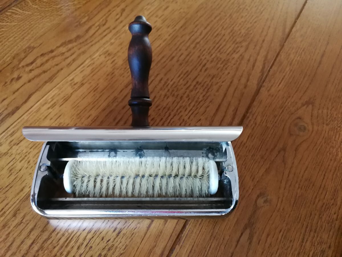 Très beau ramasse miettes en métal argenté brossé, manche en bois tourné.