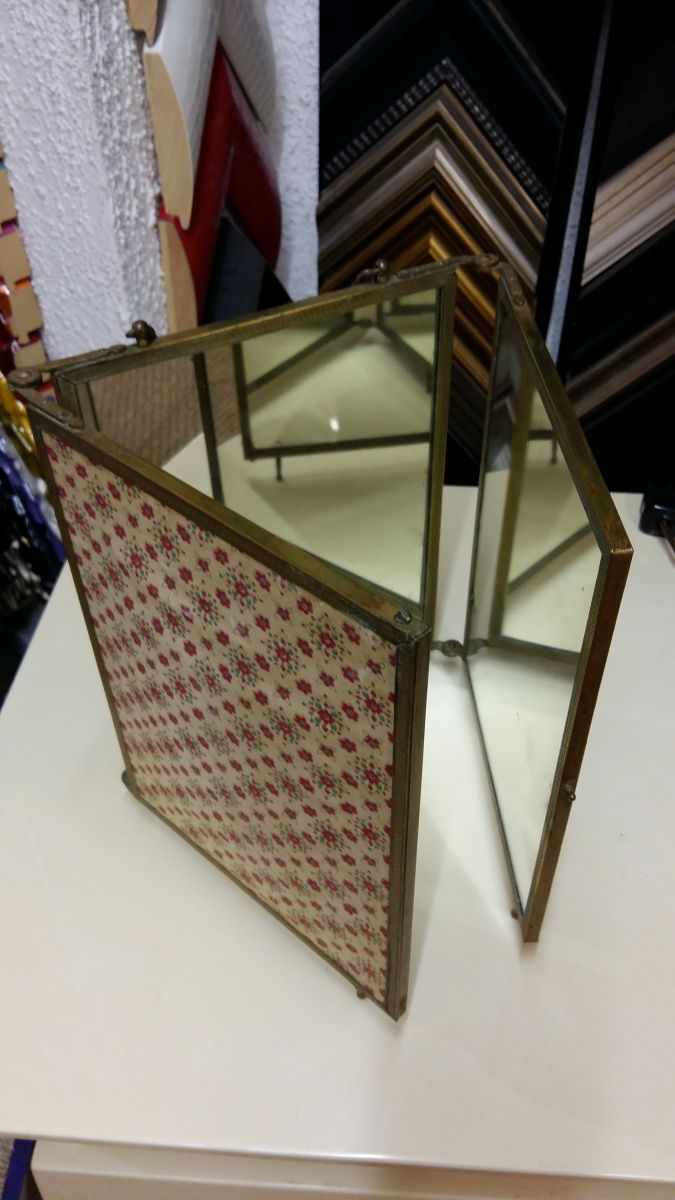 Miroir de barbier trois volets. Il peut être suspendu ou posé sur table. Un petit éclat est constaté sur le miroir de droite. Dimensions 20 X 28 fermé