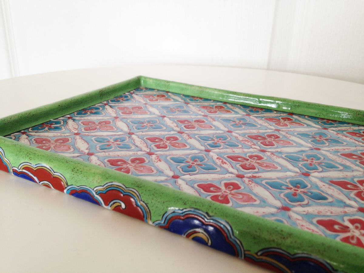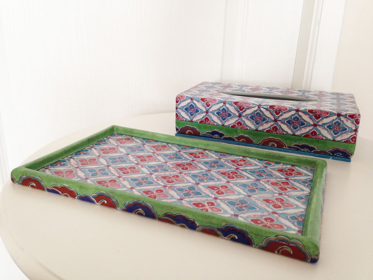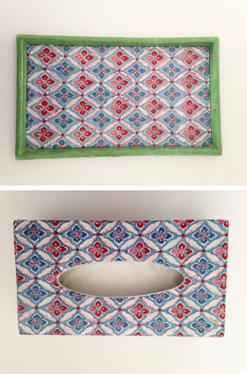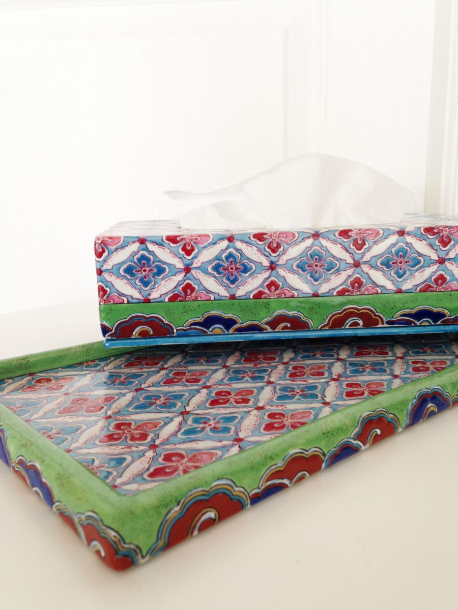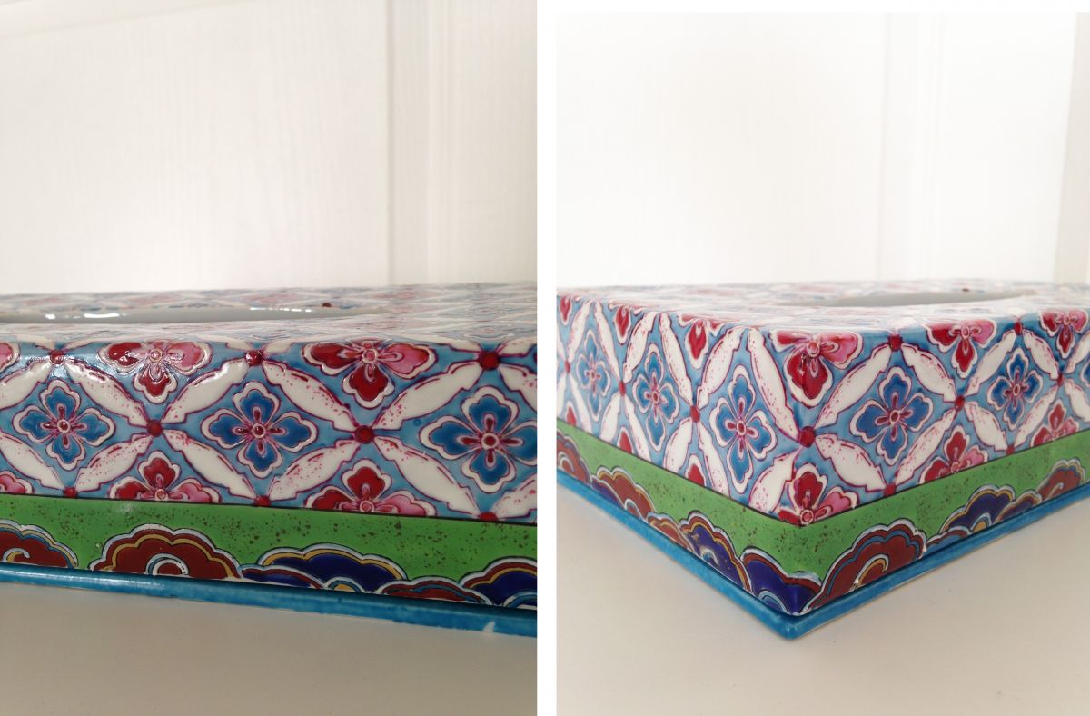 Plateau de bain et boîte à mouchoirs de la marque Takada Kenzo en porcelaine.