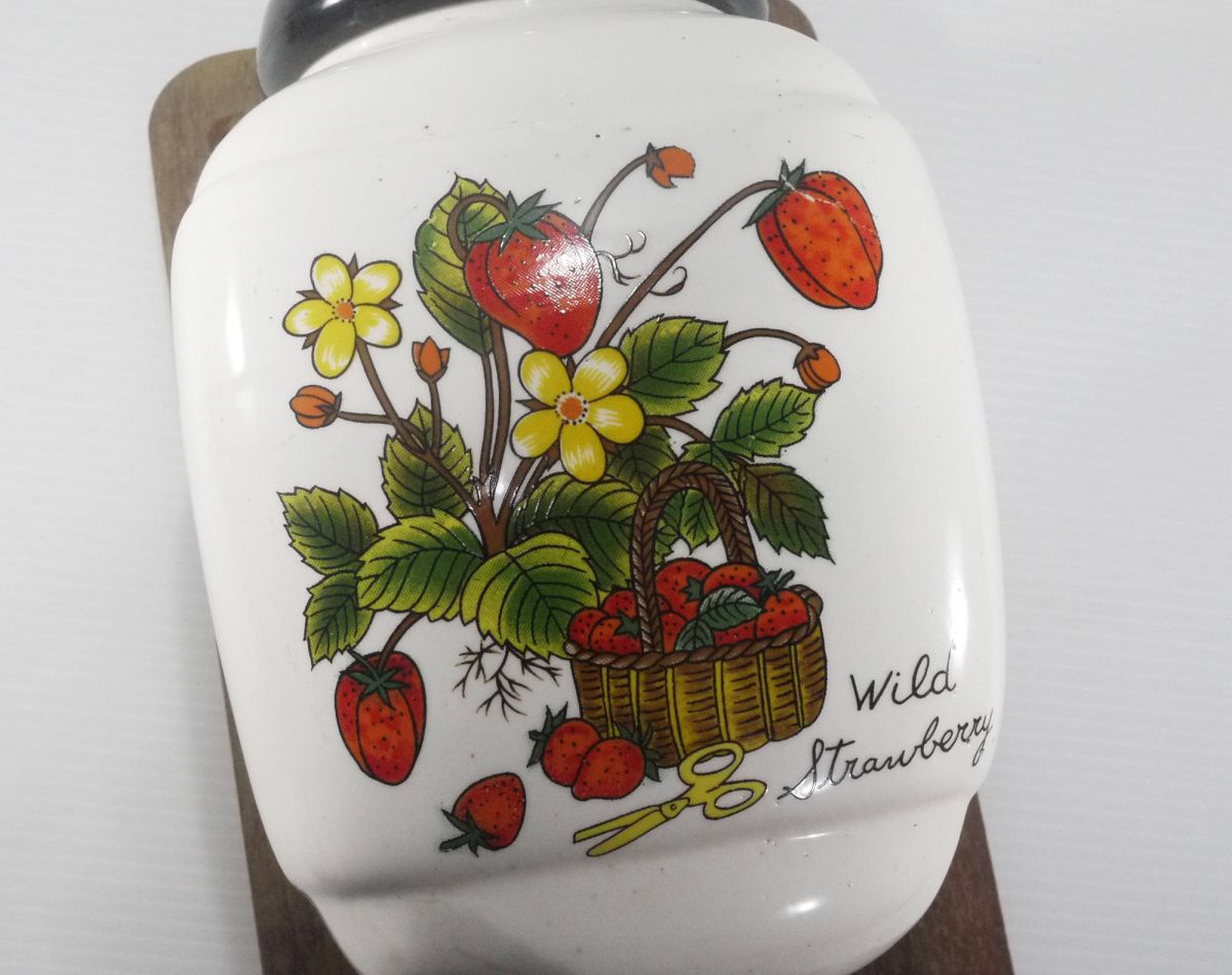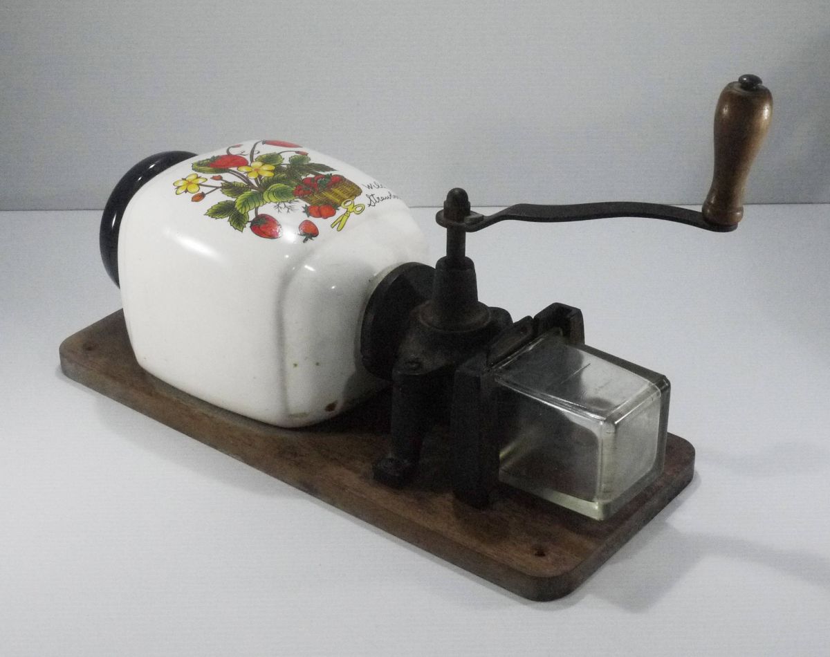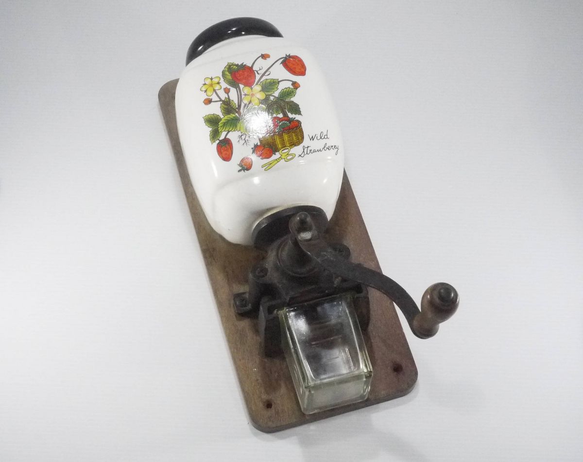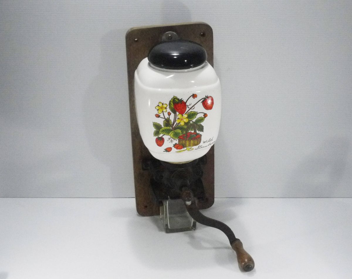 Rustique Moulin à café mural au décor fraises sauvages avec panier en osier