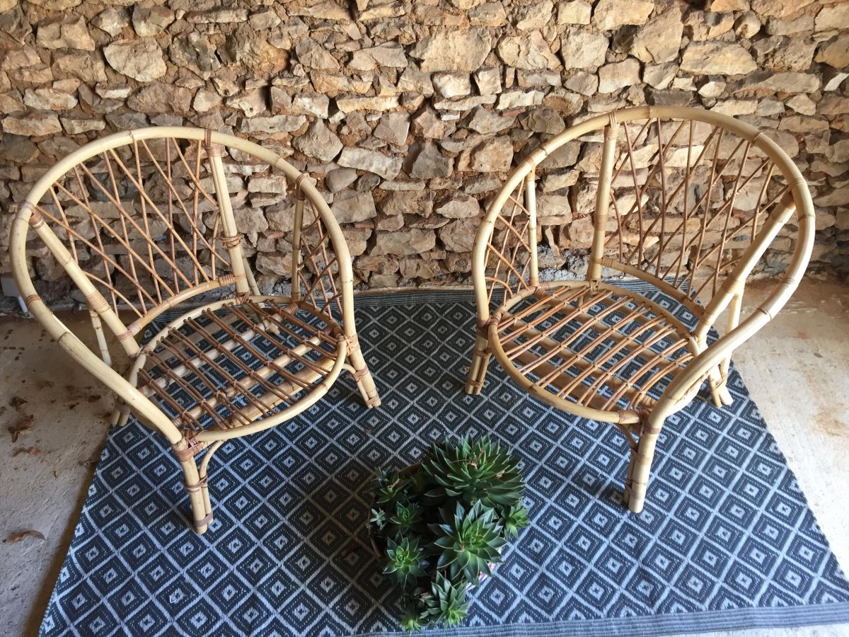 2 fauteuils en rotin de couleur clair en bon état. Dimensions : hauteur 76 x largeur 74 x profondeur 55, hauteur des pieds 29. Attention : à noter que la commande sera traitée sous 3 à 4 semaines (hors délais de livraison). Prix pour les 2 fauteuils. Livraison possible par transporteur dans toute la France.