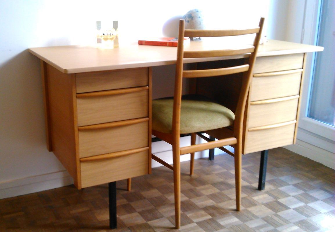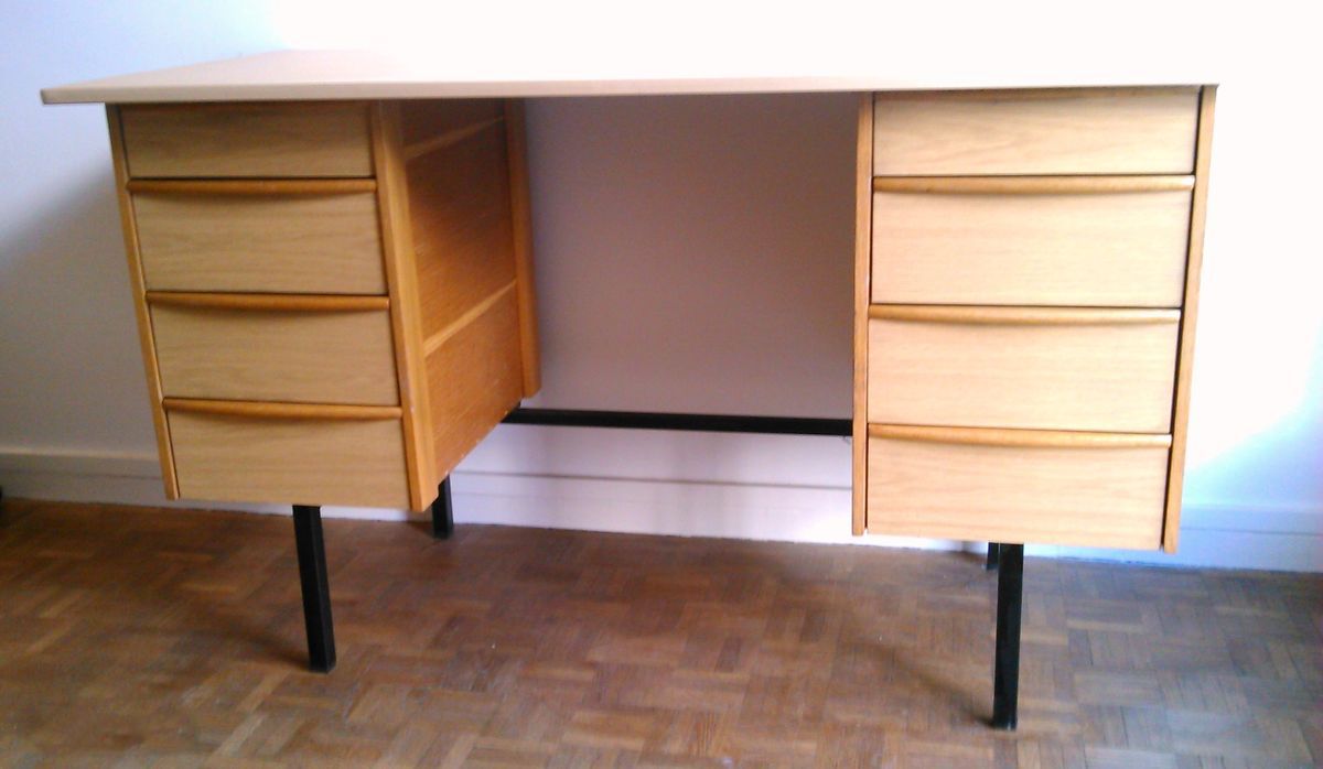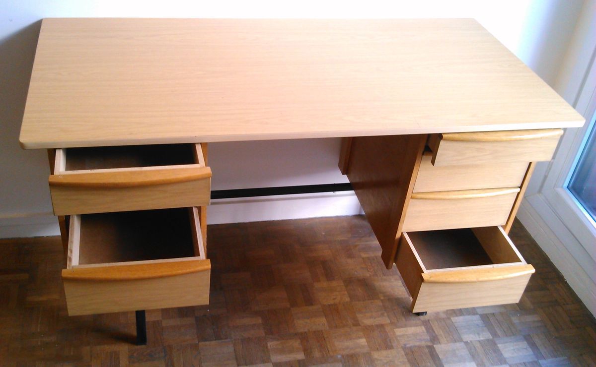 Plateau et facades en formica frêne clair, le reste en chêne, hêtre, et métal peint en noir.